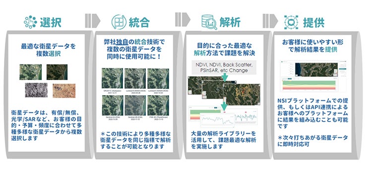一方、衛星データの入手にはコストがかかり、解析に専門的知見と時間を要することが課題です。また今後さらに衛星データが増加した際、利用者が見たい情報を的確に選び提供することが求められます。NSIは、複数の衛星データを対象に、画像の選択・統合・解析・提供といった一連のプロセスを「パイプライン」として自動化する技術を有しており、こうした課題への対応が可能です。
