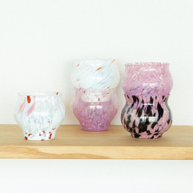 1980年頃、リサがスウェーデンのガラスメーカー、SKRUF社のために作った作品です。コップや花瓶として紹介されていることもありますが、リサ本人はキャンドルホルダーとして使っています。花吹雪のような模様は、それぞれ異なり光の影にも違いがあります。