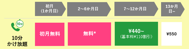 「10分かけ放題」ご利用開始月から月額料金6カ月間最大440円引き