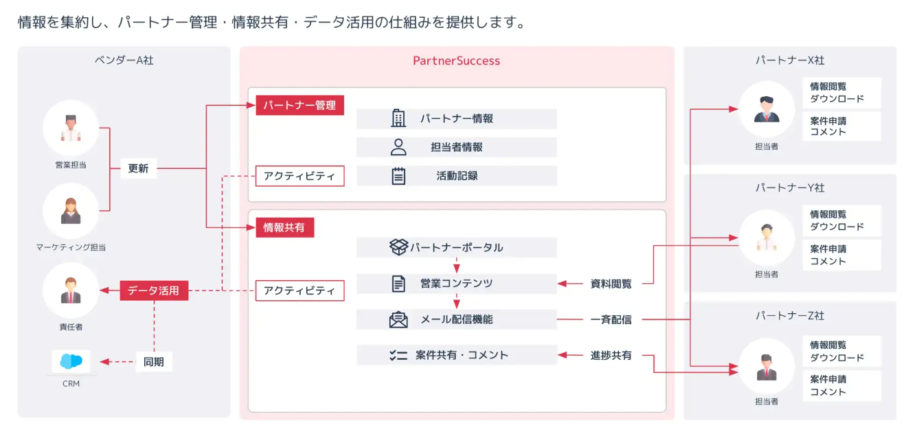 「PartnerSuccess」は、代理店管理・情報共有・データ活用の仕組みを構築し、代理店販売で業績を伸ばす、PRMクラウドサービスです。