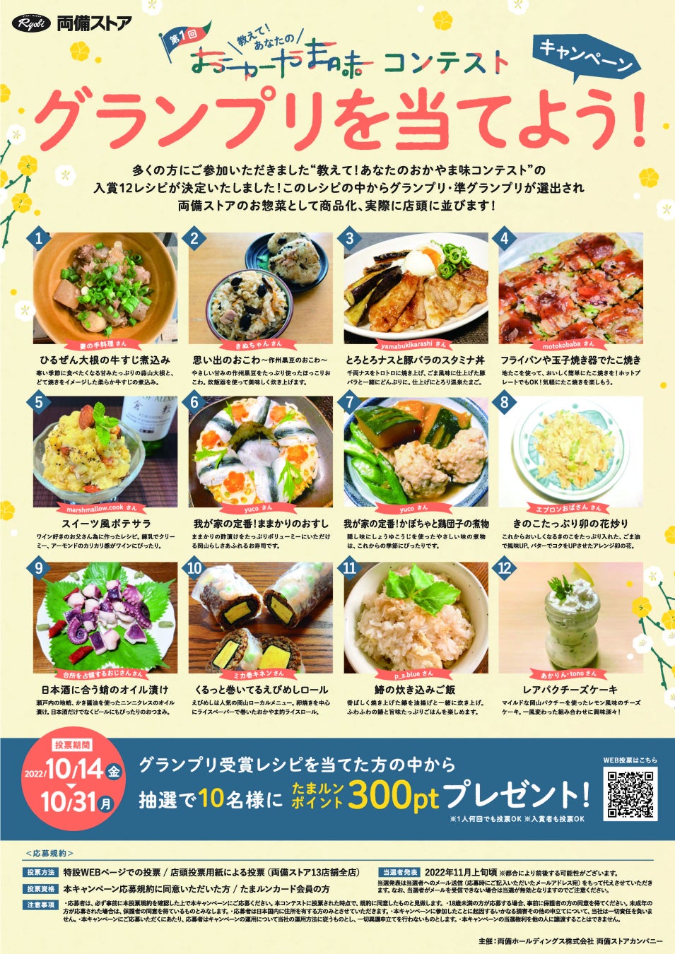 このたび、多くの方にご参加いただきました、第1回 教えて!あなたの ❝おかやま味❞ コンテスト(主催:両備ホールディングス株式会社両備ストアカンパニー)の入賞レシピ(12点)が決定しました。そこで、この12レシピの中から、グランプリに選ばれるレシピを当てるキャンペーンを2022年10月14日から開催しますので、お知らせします。