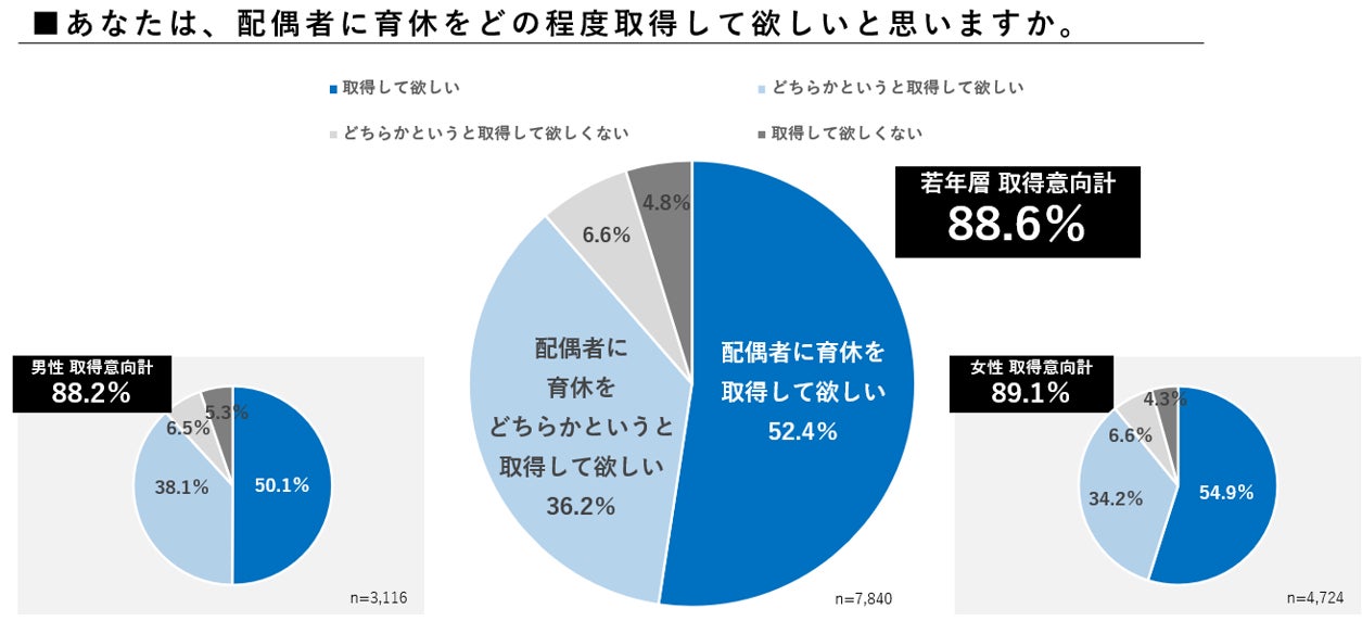 また、88.6%の若年層が、配偶者に育児休業を取得してもらいたいと考えており、