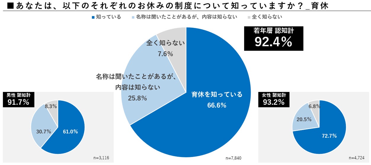 「育児休業制度」の認知度について、若年層の92.4%が「知っている」と回答しています。男女別でも90%以上が知っていると回答し、非常に高い結果となりました。