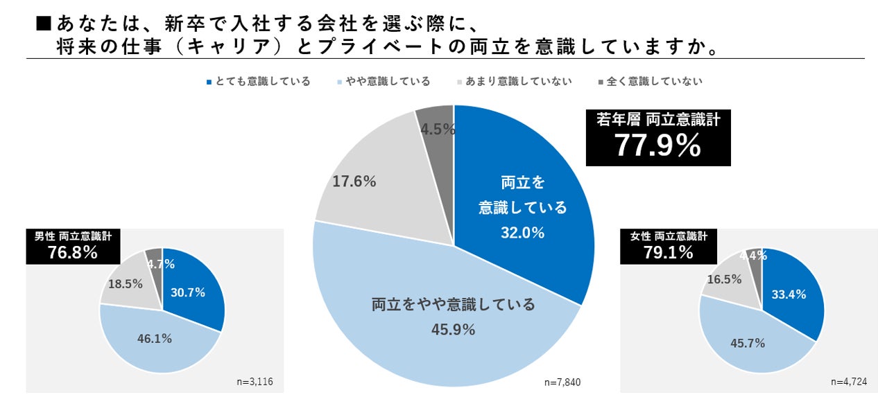 「新卒で入社をする会社を選ぶ際に、将来の仕事(キャリア)とプライベートの両立を意識していますか」の問いに対し、77.9%(男女合計)が両立を意識していると回答しました。男女別では、男性の76.8%、女性の79.1%が、仕事とプライベートを両立できる働き方をしたいと思っていることがうかがえます。