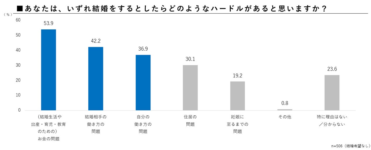調査時点で結婚の意向がない若年層に対し、「結婚のハードル」について質問したところ、「お金の問題」が53.9%と最も高く、次いで「結婚相手の働き方」(42.2%)、「自分の働き方」(36.9%)という結果になりました。