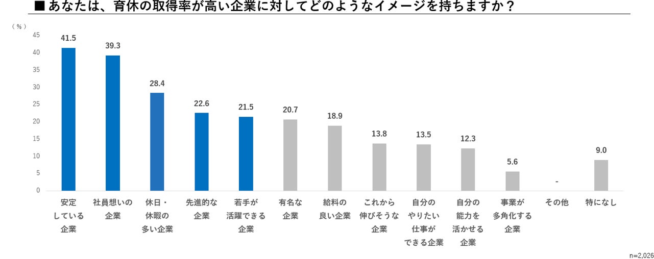 また、「育休取得率が高い企業に対するイメージ」については、「安定している企業」(41.5%)、「社員想いの企業」(39.3%)、「休日・休暇の多い企業」(28.4%)、「先進的な企業」(22.6%)、「若手が活躍できる企業」(21.5%)と続き、育休取得率が高い企業に対しては、ポジティブなイメージを抱いていることが明らかになりました。