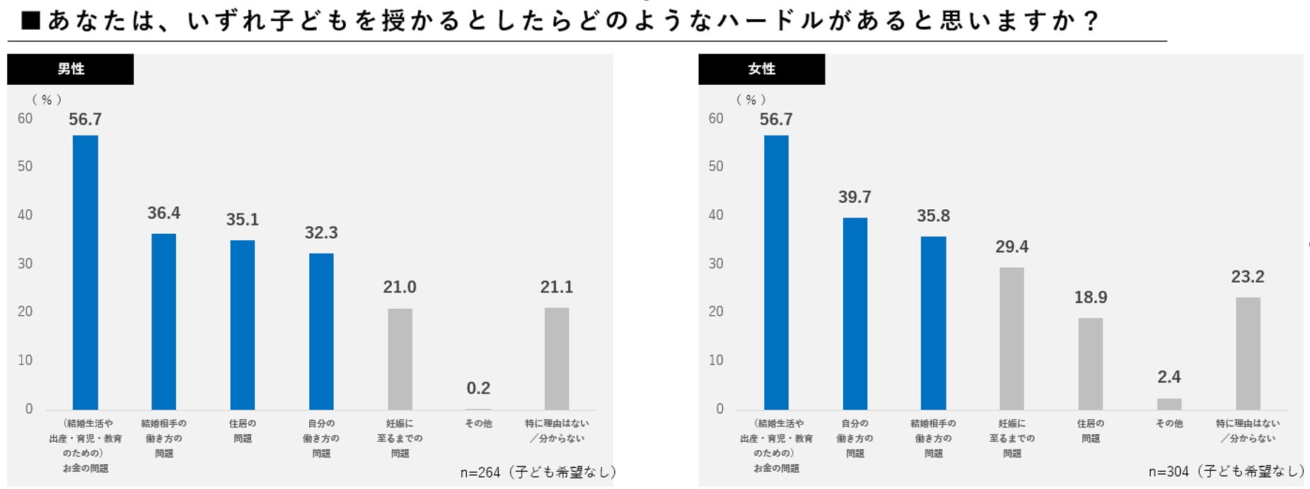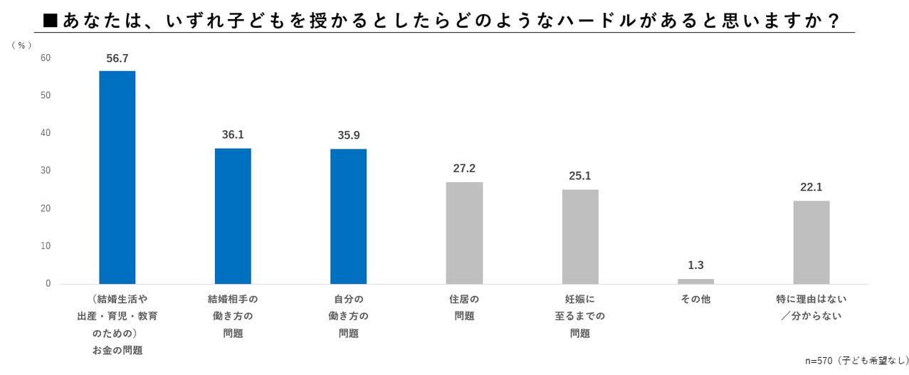 調査時点で子どもを授かることについての意向がない若年層に対し、子育てのハードルについて質問したところ、「お金の問題」が56.7%と最も高く、次に「結婚相手の働き方の問題」(36.1%)、「自分の働き方の問題」(35.9%)と、ライフイベントの共通課題が明らかとなりました。
