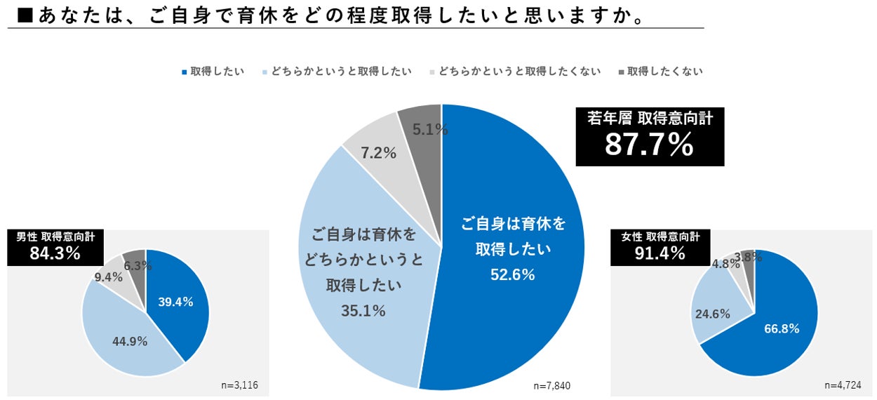 また、若年層に「自分自身は育休を取得したいか」と尋ねたところ、「取得したい」が87.7%と9割近い結果になりました。男女別では、女性91.4%、男性84.3%と、多少の男女差はあるものの、男女ともに9割程度の若年層が、育休取得意向がある結果となりました。