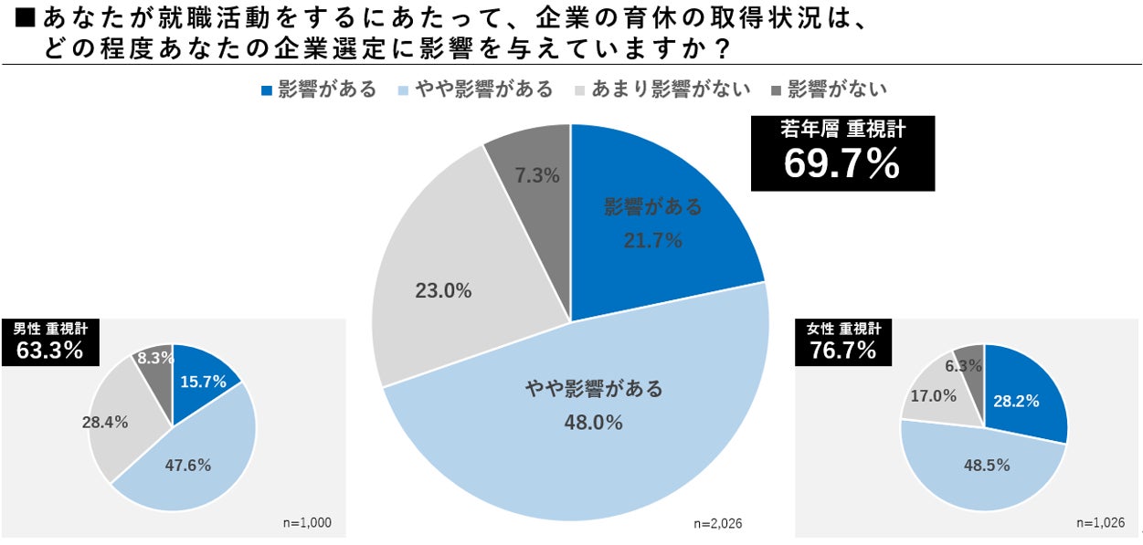 「就職活動にあたって企業選定における育休取得情報の影響度」を尋ねたところ、69.7%の若年層が影響があると回答しています。男女別では、男性63.3%、女性76.7%が影響があると回答し、女性の方がやや重要度が高い結果となりました。