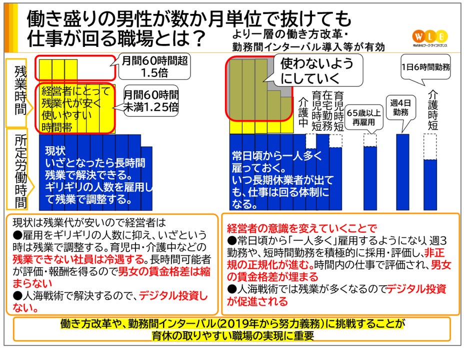 こうした組織になっていくことが重要です。より一層の働き方改革を進め、2019年から努力義務になっている勤務間インターバルを導入することなどに挑戦することが、育休の取りやすい職場の実現に重要です。