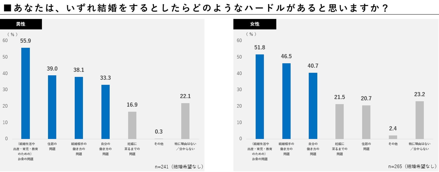 男女別の回答結果では、第2位の項目に違いがみられ、男性は「お金の問題」(55.9%)に次いで、「住居の問題」(39.0%)という回答が多かったのに対し、女性は「結婚相手の働き方の問題」(46.5%)が「お金の問題」(51.8%)に次いで多い回答結果となりました。
