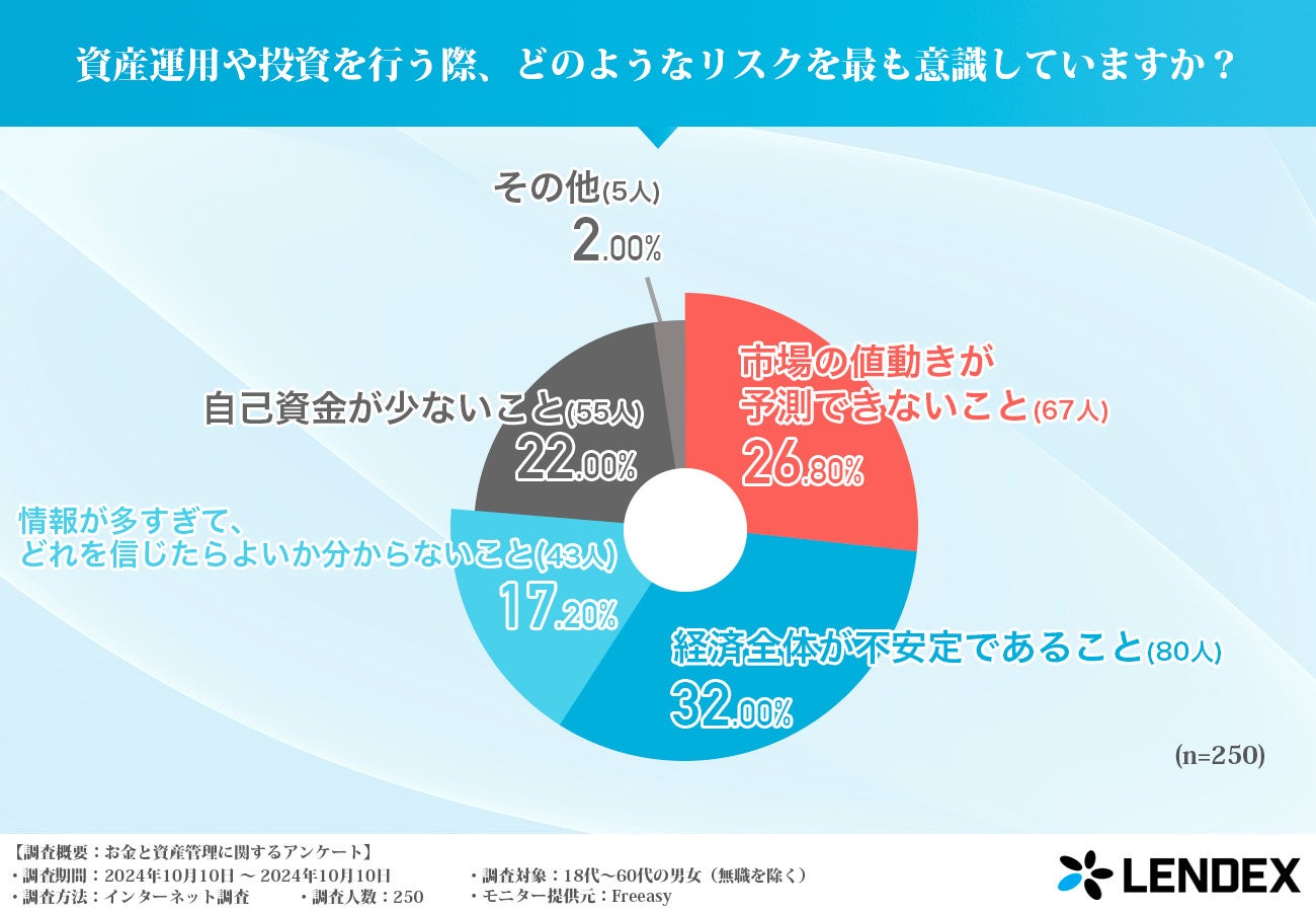 資産運用や投資において、32%の回答者が「経済の不安定さ」を最もリスクとして意識していると回答しました。次いで「市場の値動きが予測できない」が26.80%、また「自己資金不足」をリスクと感じている人も22%いることが明らかになりました。