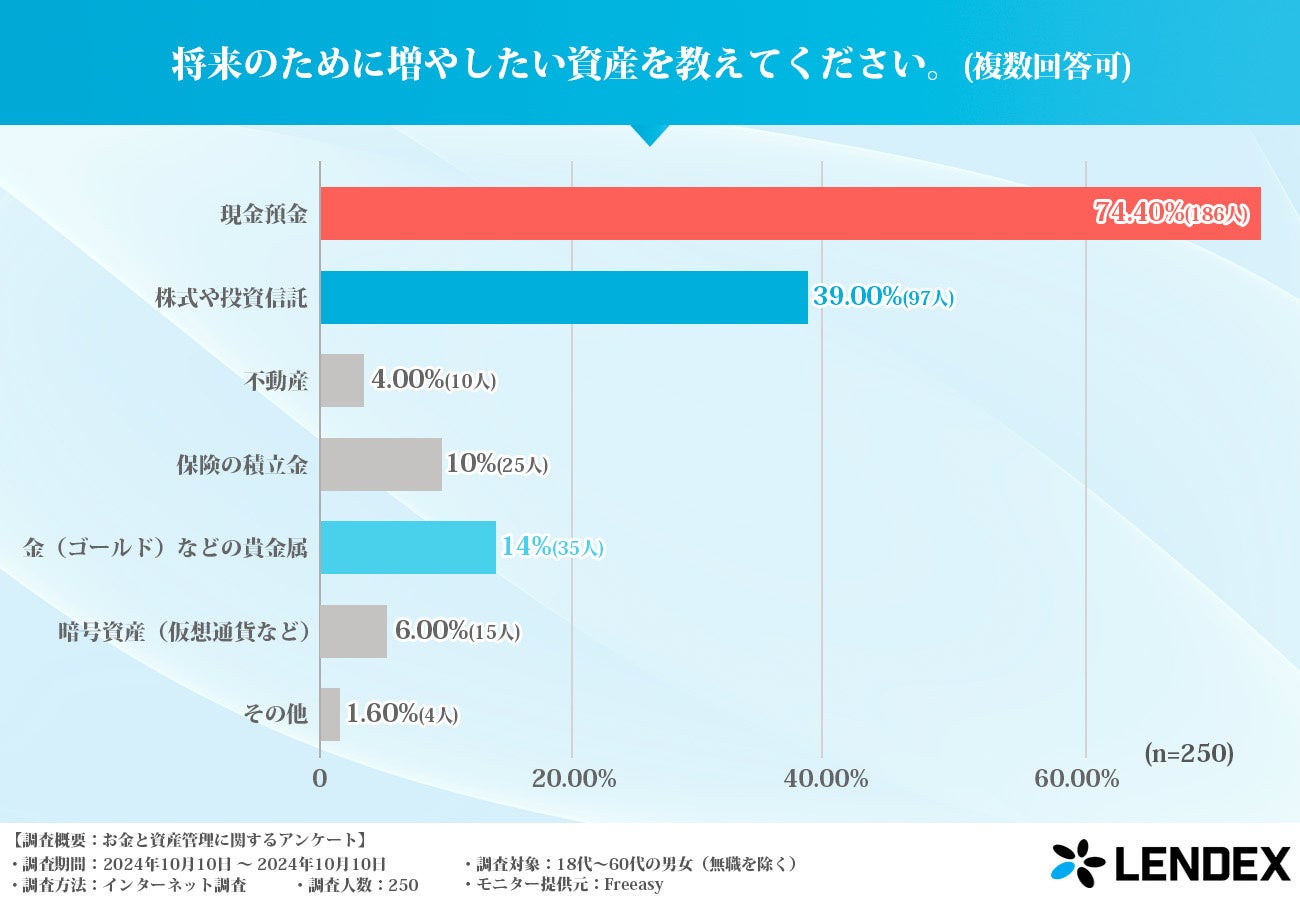 将来に向けた資産形成として最も増やしたい資産は「現金預金」で、全体の74.40%がこれを選んでいます。一方で、「株式や投資信託」を選んだ人も39%と、比較的リスクのある資産運用も検討されていることがわかります。