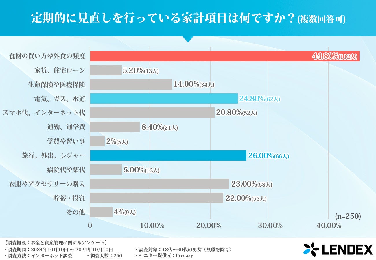 家計の見直しにおいて最も頻繁に見直されている項目は「食費」であり、44.80%が定期的に見直していると回答しました。