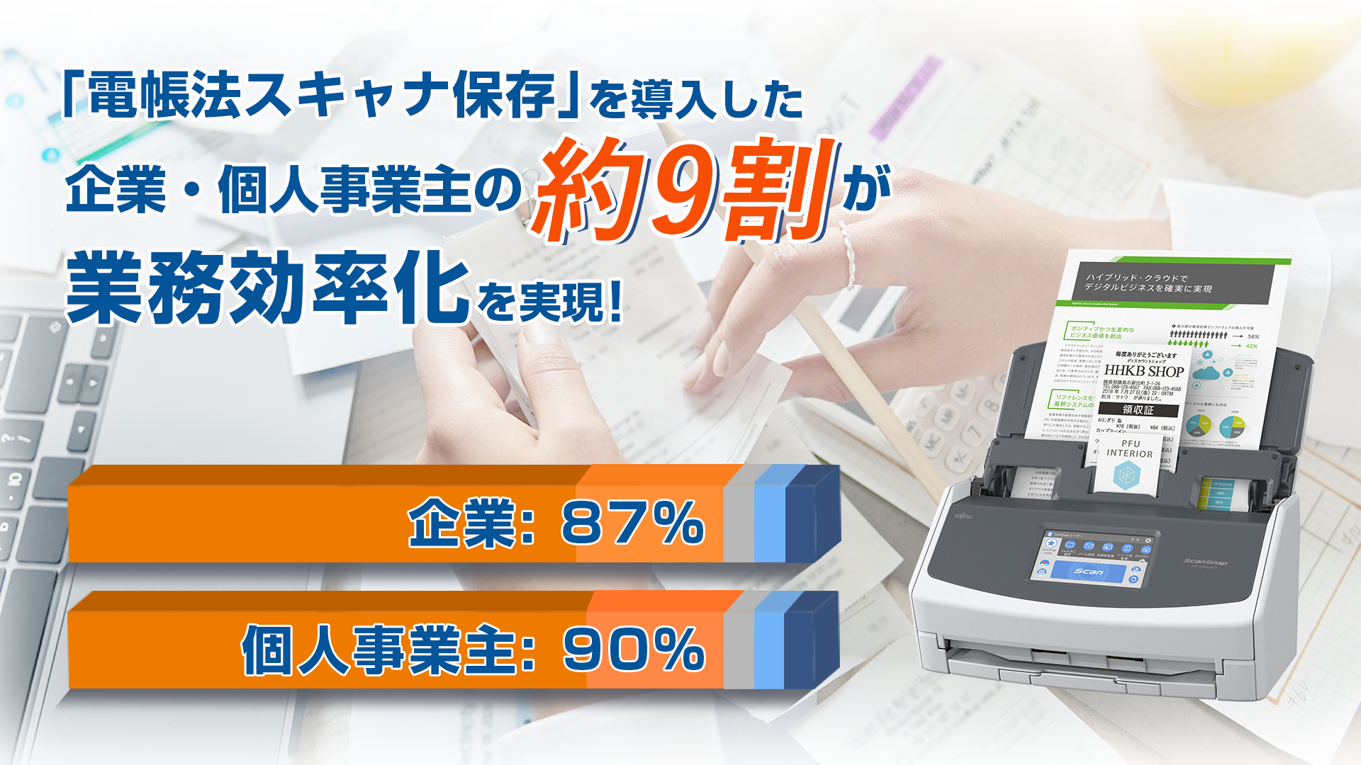2023年8月にPFUが発表したアンケート(注2)では、電帳法スキャナ保存を導入の企業、個人事業主共に、9割近くが業務効率化に効果ありと回答しています。「証憑の検索性向上」、「会計ソフトへの入力効率化」、「事務所スペース削減」、さらには「テレワークでの活用」にも寄与しています。