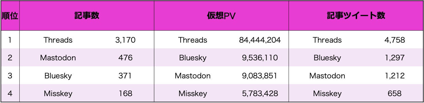 - Threadsが圧倒的1位。2位との差は記事数で6.6倍、PVで8.9倍、記事ツイートで3.7倍