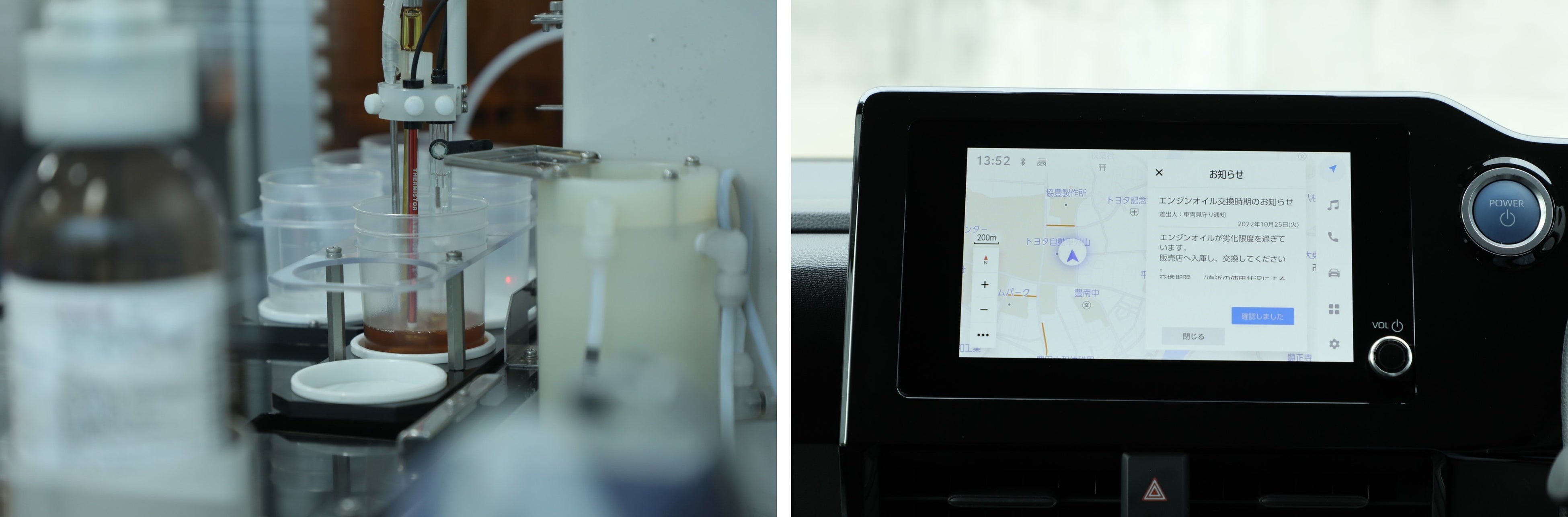 (コネクティッドカーケアの技術開発風景と、エンジンオイル交換のご提案イメージ)