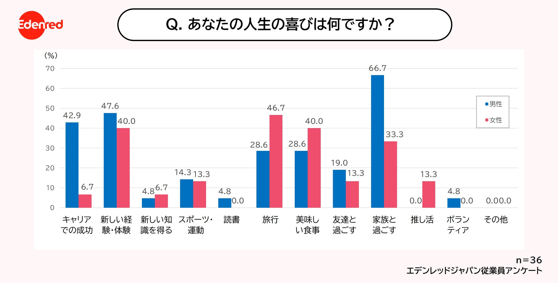 エデンレッドジャパンでは、「Power up your joie de vivre(生きる喜びを、もっと。)」と呼応する取り組みとして、当社従業員を対象に、「Q. あなたの人生の喜びは何ですか?」をテーマとしたアンケートを実施しました。働く環境や価値観が変化する中、従業員の“喜び”の源泉を可視化することで、企業が提供できる支援や、福利厚生・エンゲージメント施策が果たし得る役割を改めて捉え直すことを目的としています。
