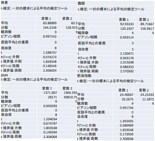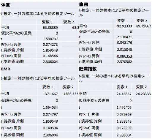 それぞれP値は有意水準である0・05より大きな値であると言えるため、体重、腹囲、BMR、肥満度指数について有意差がないと言えます。