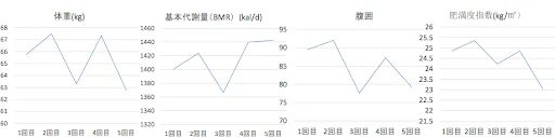 アメリカのAbidov.Mらの報告ではザンシゲン600㎎によって4ヶ月で体重が6.3㎏減少したというデータもあり、内臓脂肪や体重の増減などデータの変化がみられるかどうかサプリメントの効果を確かめました。