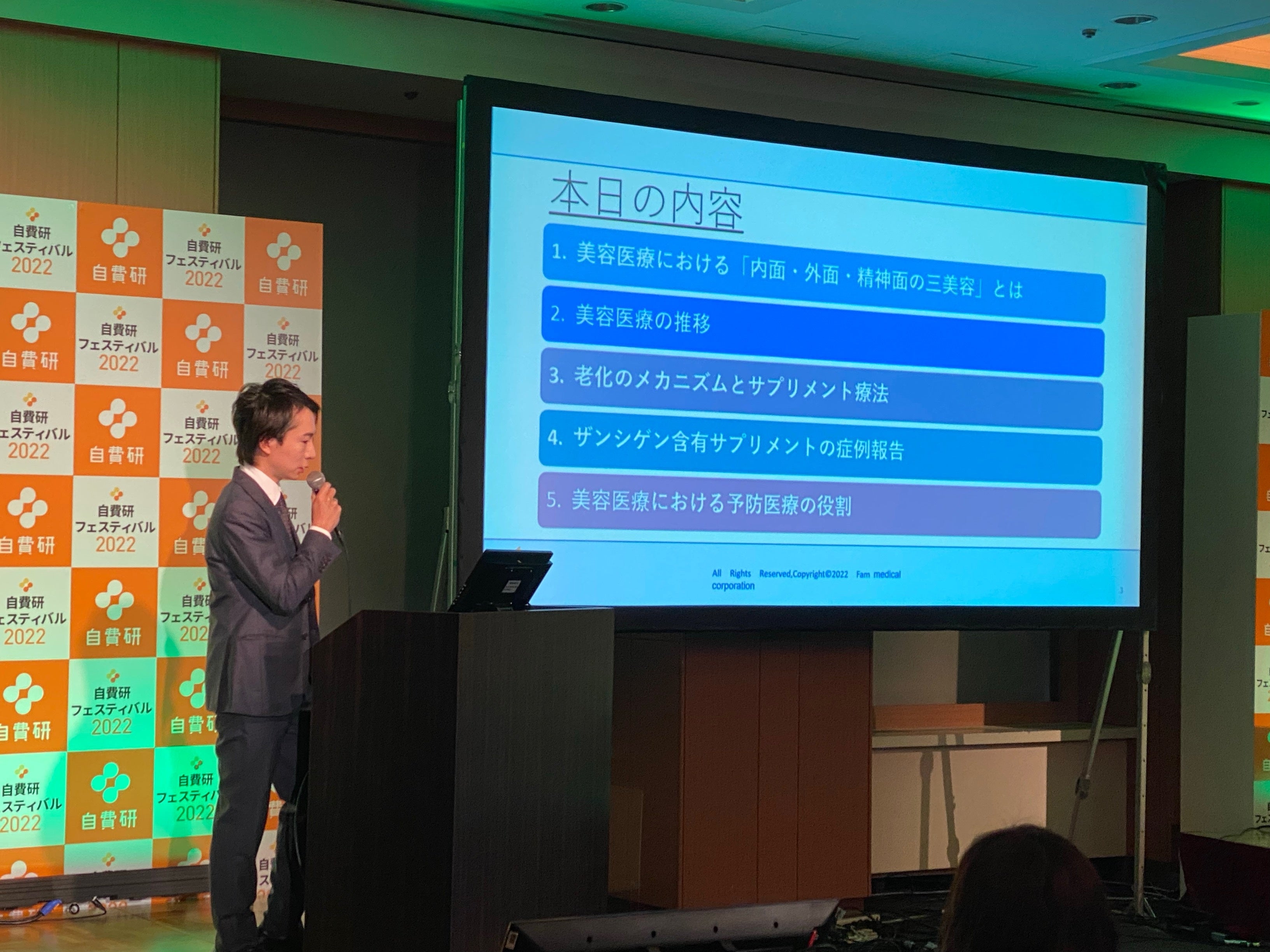 一般社団法人 予防医療研究協会(所在地:東京都千代田区、会長:苅部淳、理事長:髙木希奈)「苅部淳」会長は、2022年10月16日(日)に開催された、主催:一般社団法人 日本顎顔面美容医療協会、企画運営事務局:自費研株式会社の自費診療イベント『自費研フェスティバル2022』に「予防医療におけるサプリメントの活用」について登壇しました。