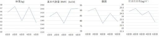 体重・体脂肪・BMIに関して、投与後にはほぼすべての方で減少傾向が見られました。徐脂肪量や基礎代謝率に関しては明らかな変化は見られませんでした。