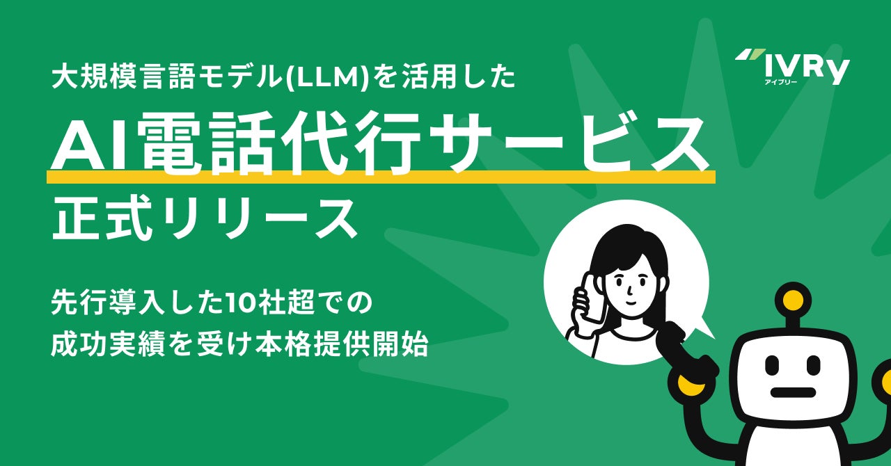 電話AI SaaSのIVRy、大規模言語モデル(LLM)を活用した「AI電話代行サービス」正式リリース 〜先行導入した10社超での成功実績を受け本格提供を開始〜