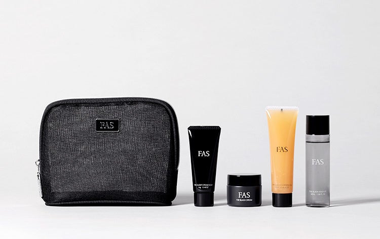 FAS ザ ブラック エッセンス 200mL、FAS ザ クリア クレンジングジェル180mL、FAS ザ ブラック ナイトチャージマスクに加え、FAS ザ ブラック クリーム (販売名:Fクリーム 医薬部外品)と FAS ザ ブラック エーシーオイルセラム 3mL(非売品)、FAS ザ クリア クリームソープのミニサイズを合わせたキットにいたしました。