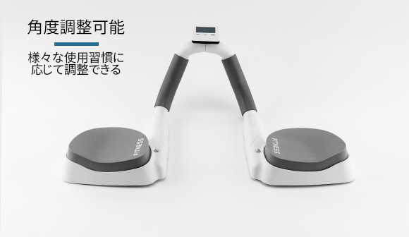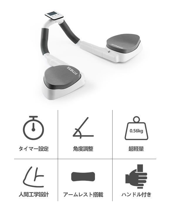 時間設定が可能なタイマー。鍛えたい部位に合わせた角度調整式。肘への負担を軽減できる人間工学に基づいた設計。