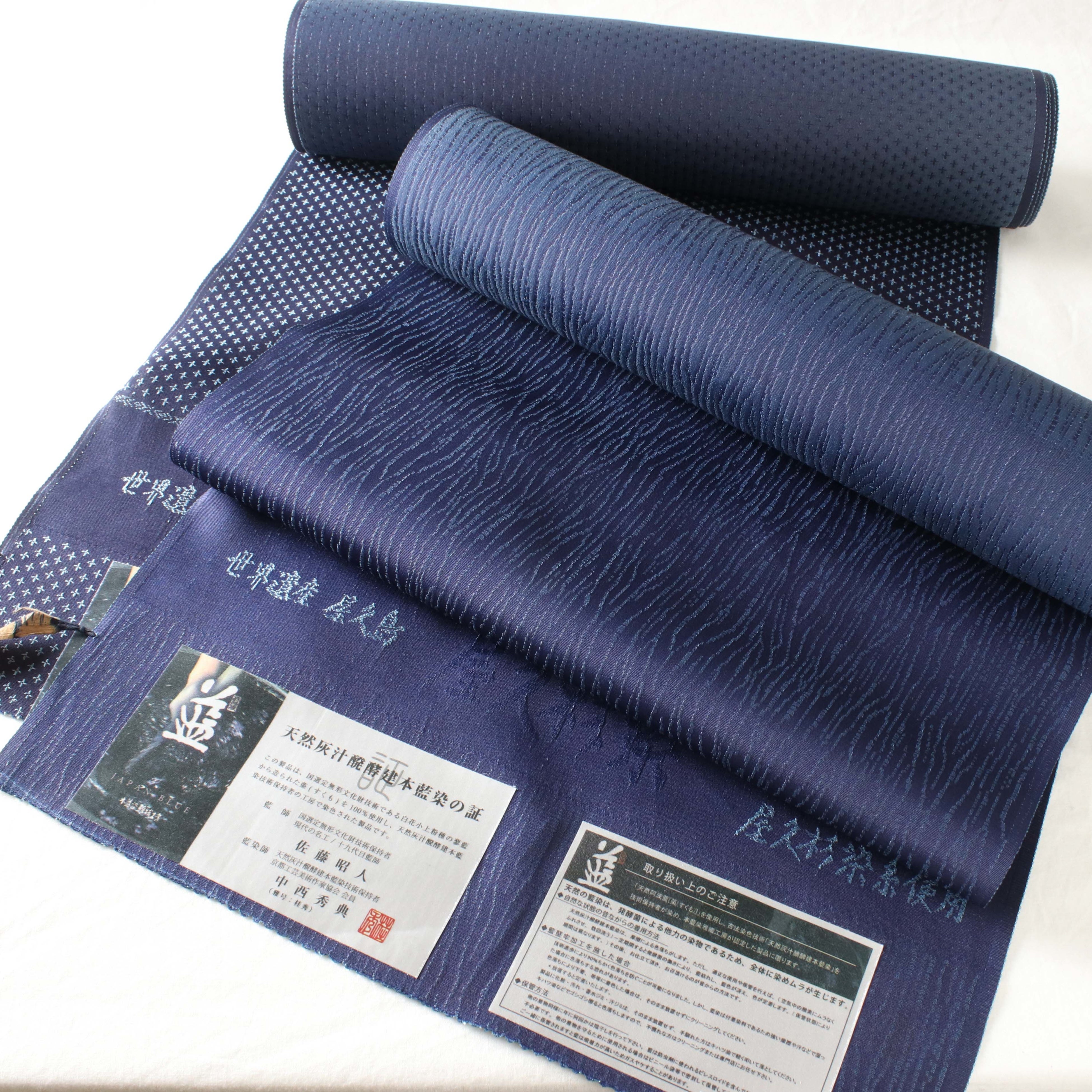 100%天然染料で染められた藍染の着物や帯の作品もご覧いただけます。