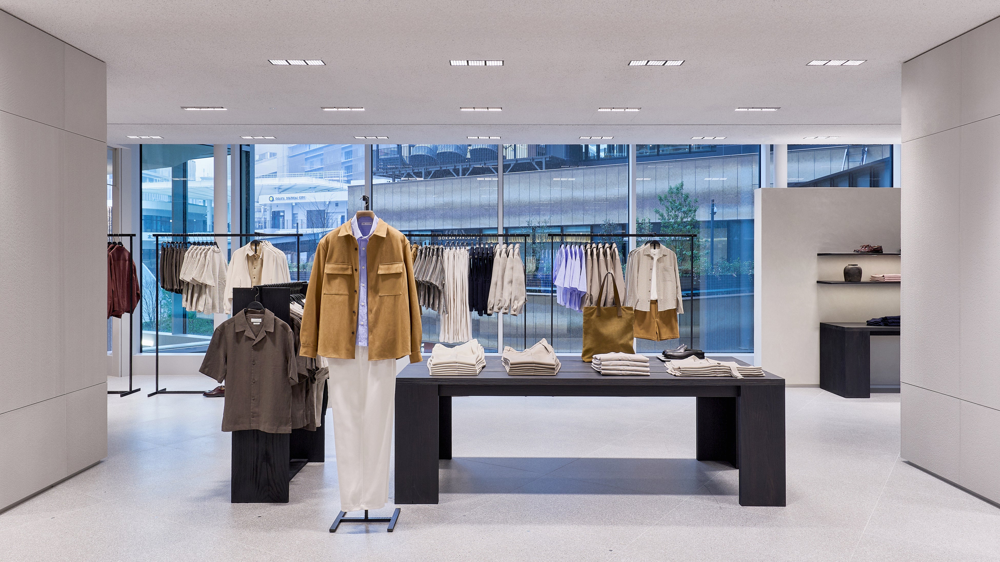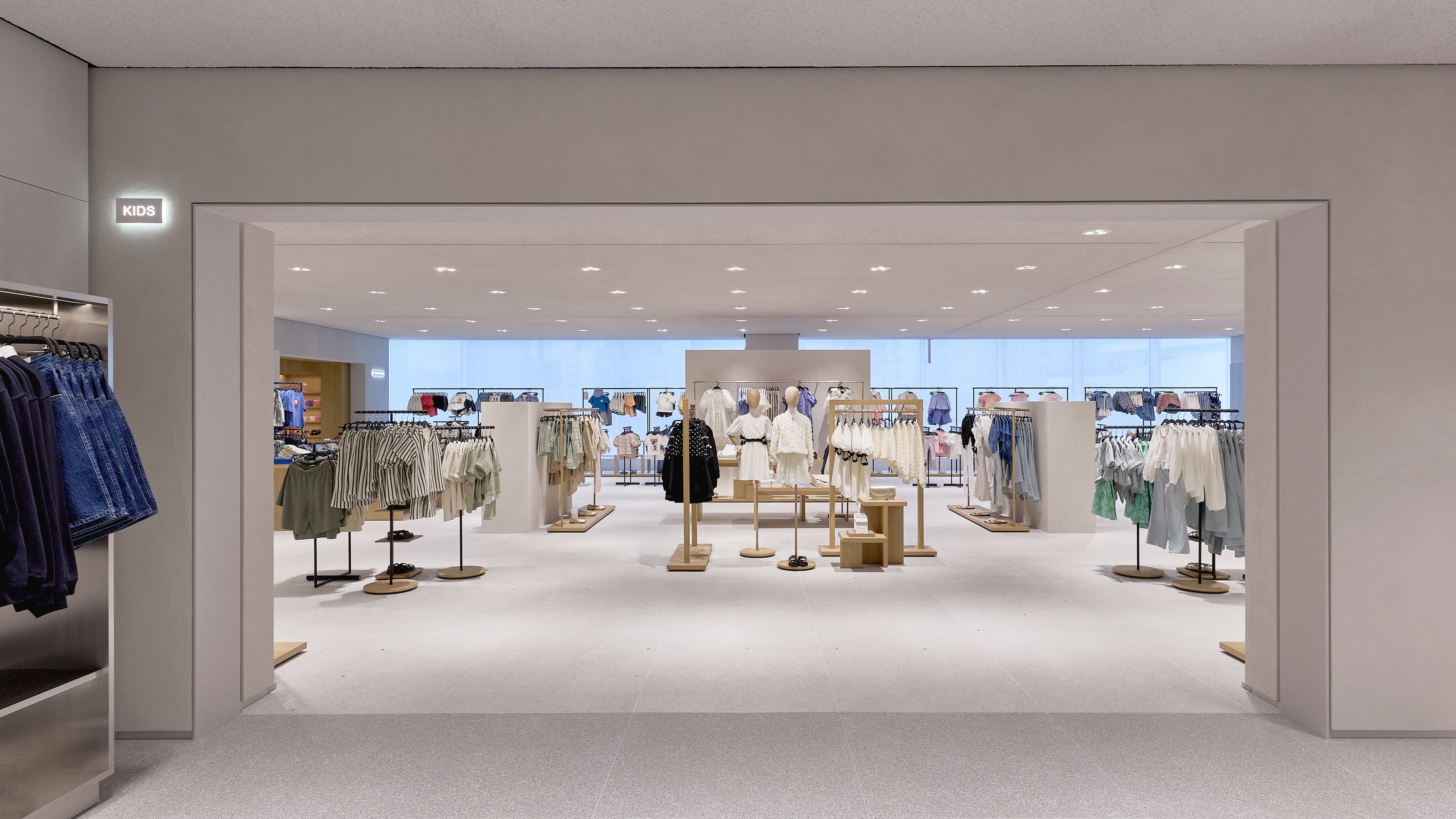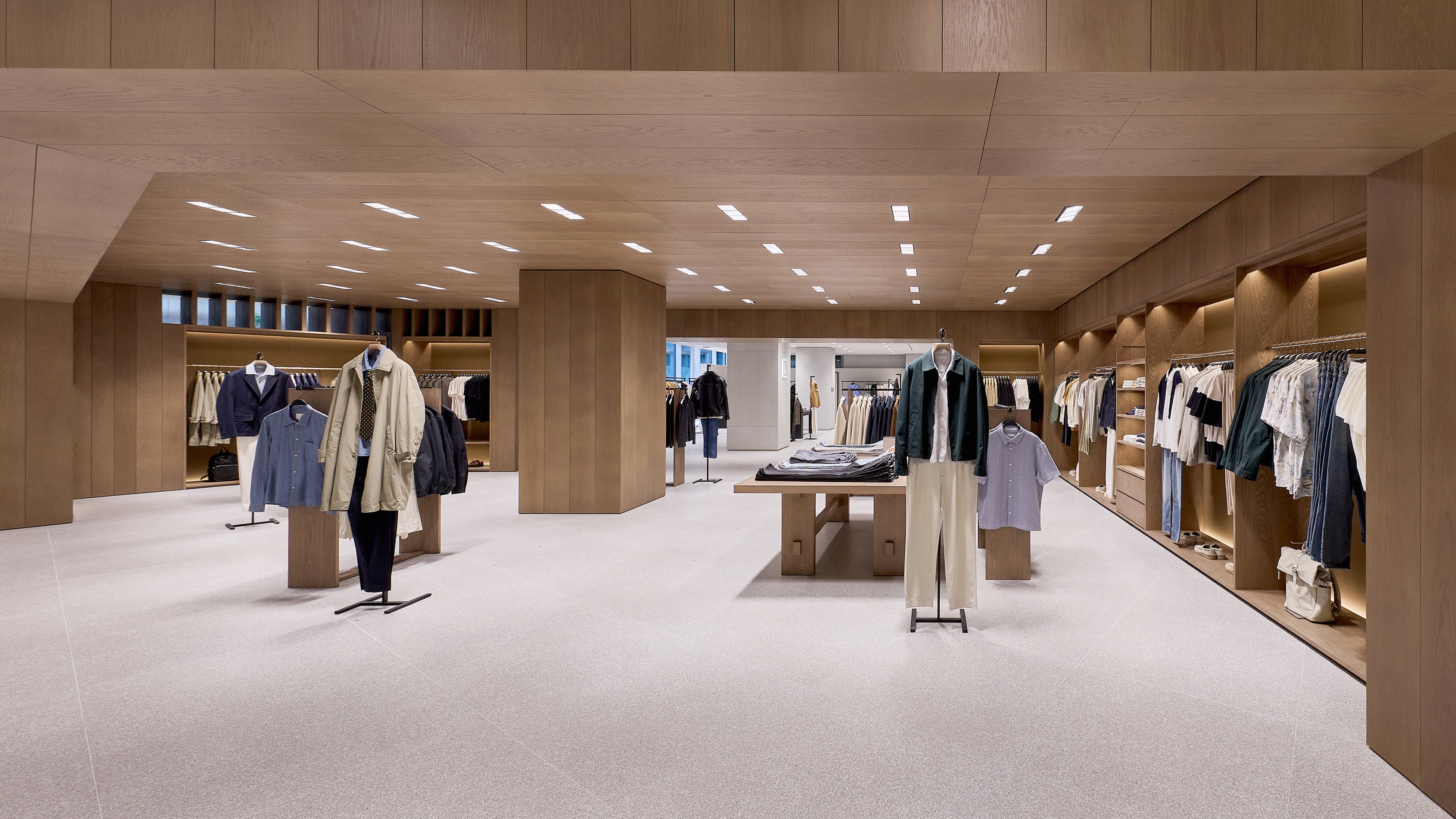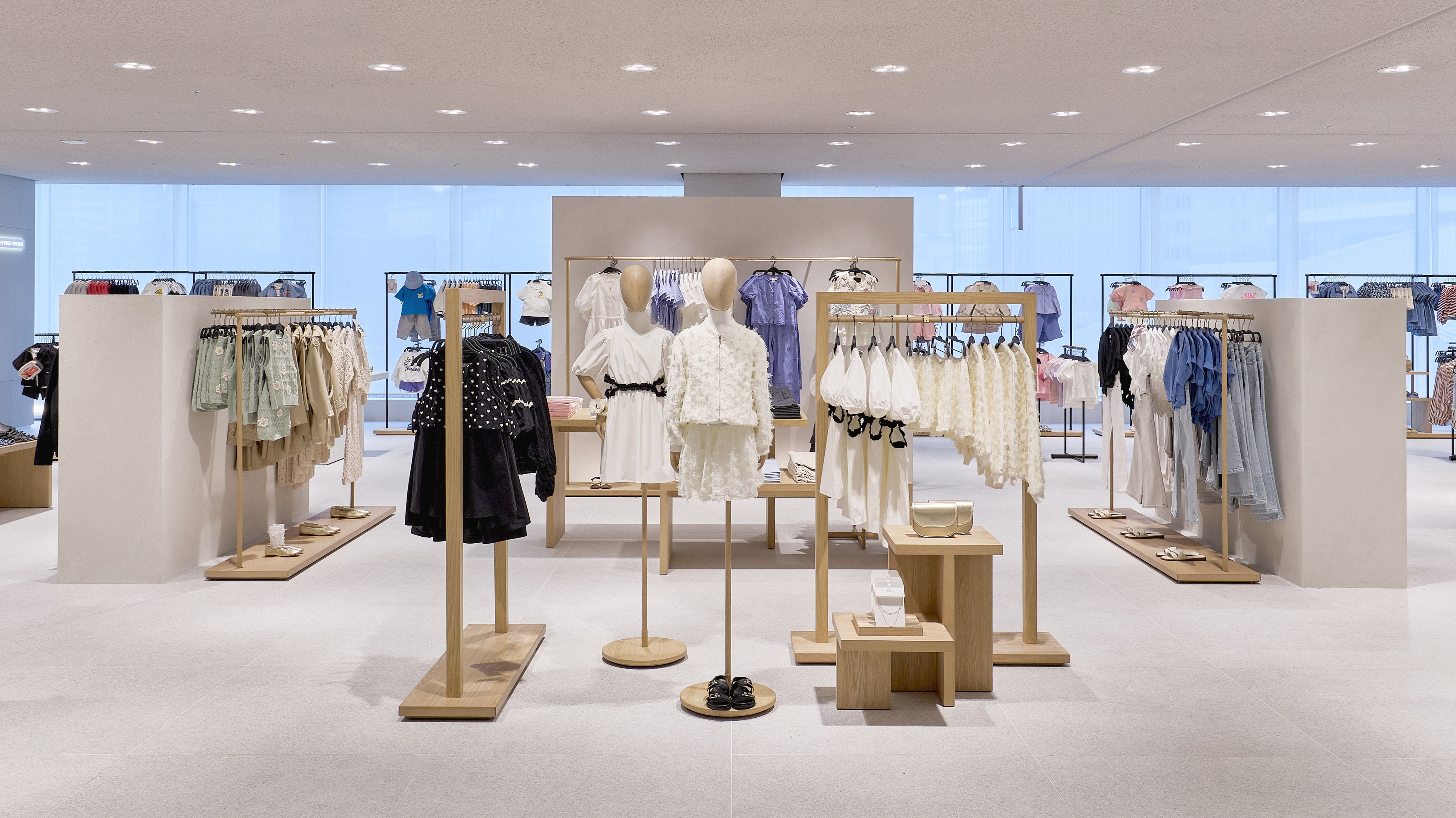 ストア面積は約 1,700㎡ に及び、2フロアにわたってウィメンズ、メンズ、キッズのコレクションを展開。ZARAの建築スタジオが手がけた内装デザインは、洗練されたライトグレーを基調とし、木製什器やテキスタイルの自然な色合いが温かみを添える、クリーンで落ち着いた空間となっています。