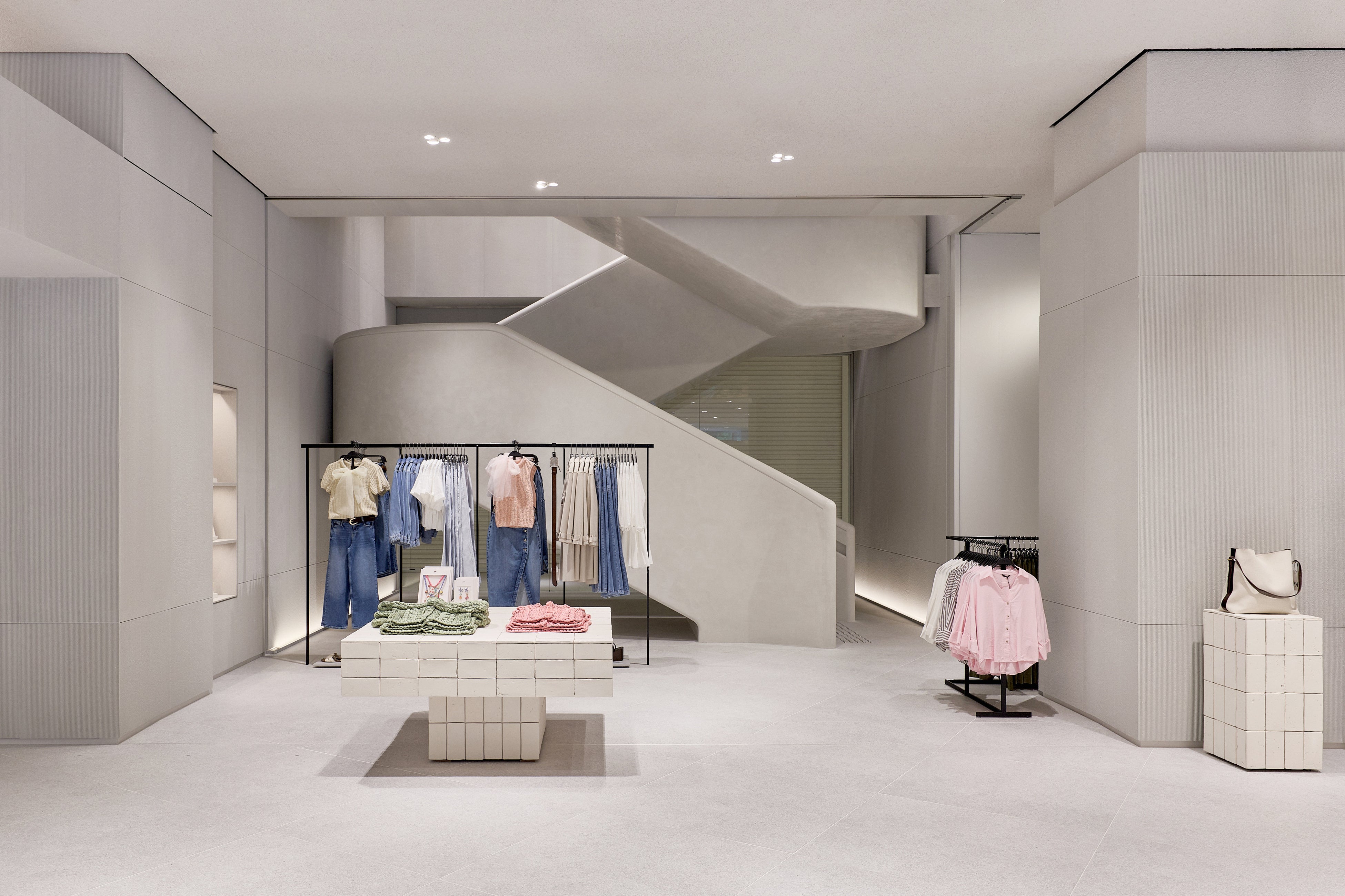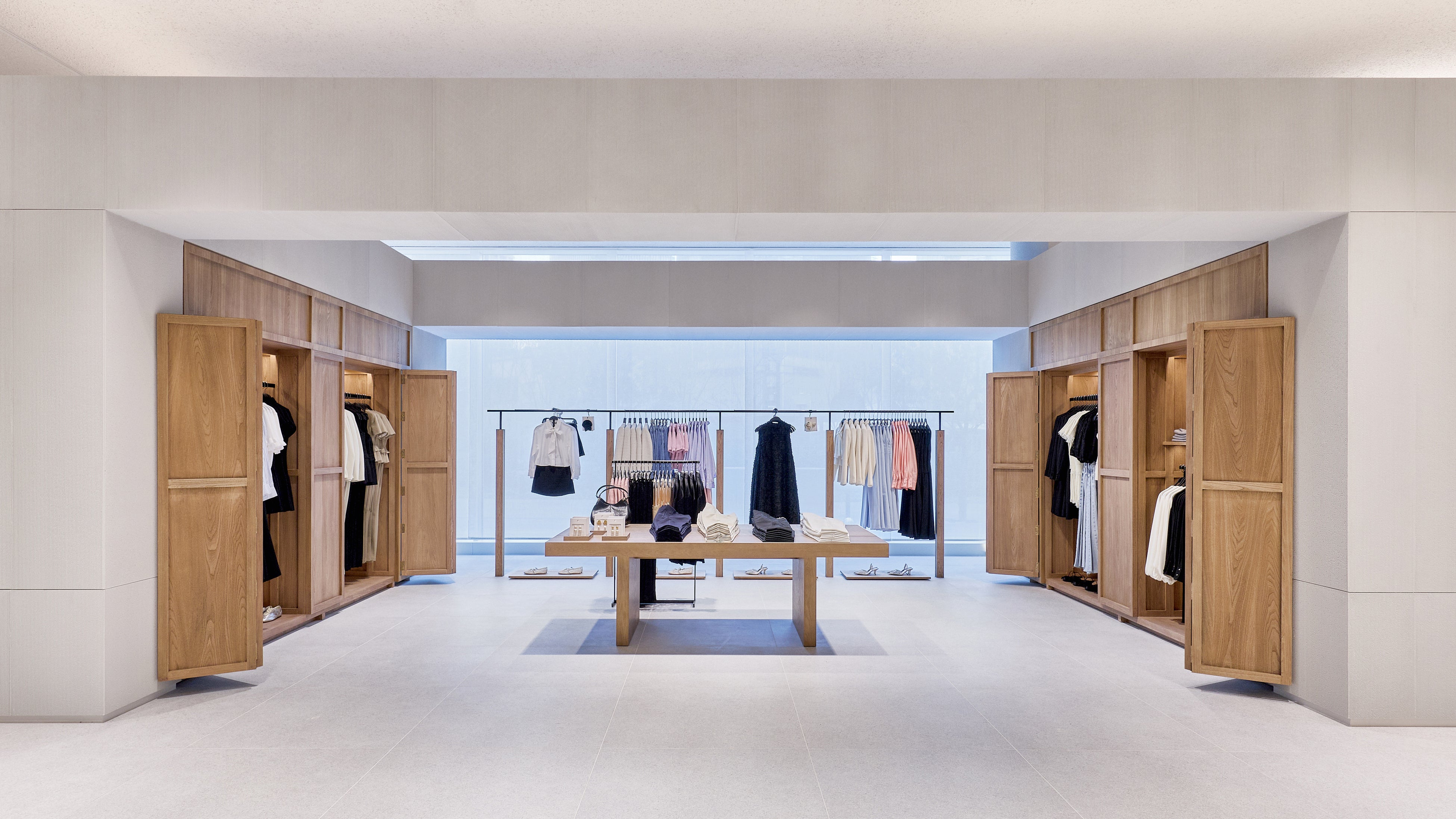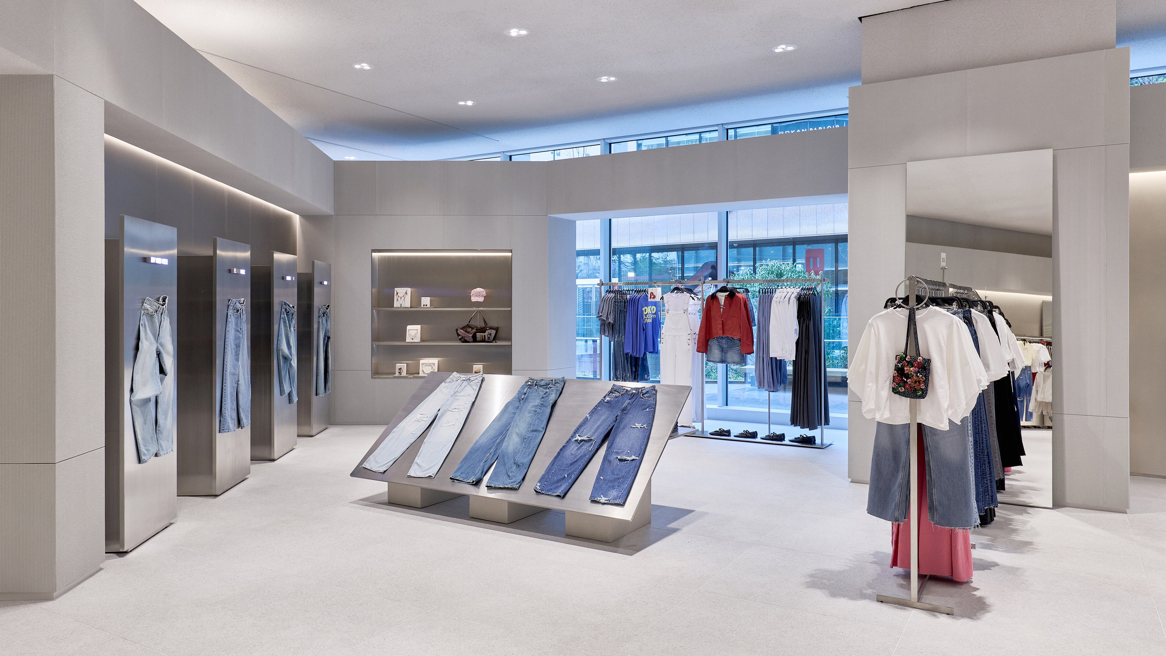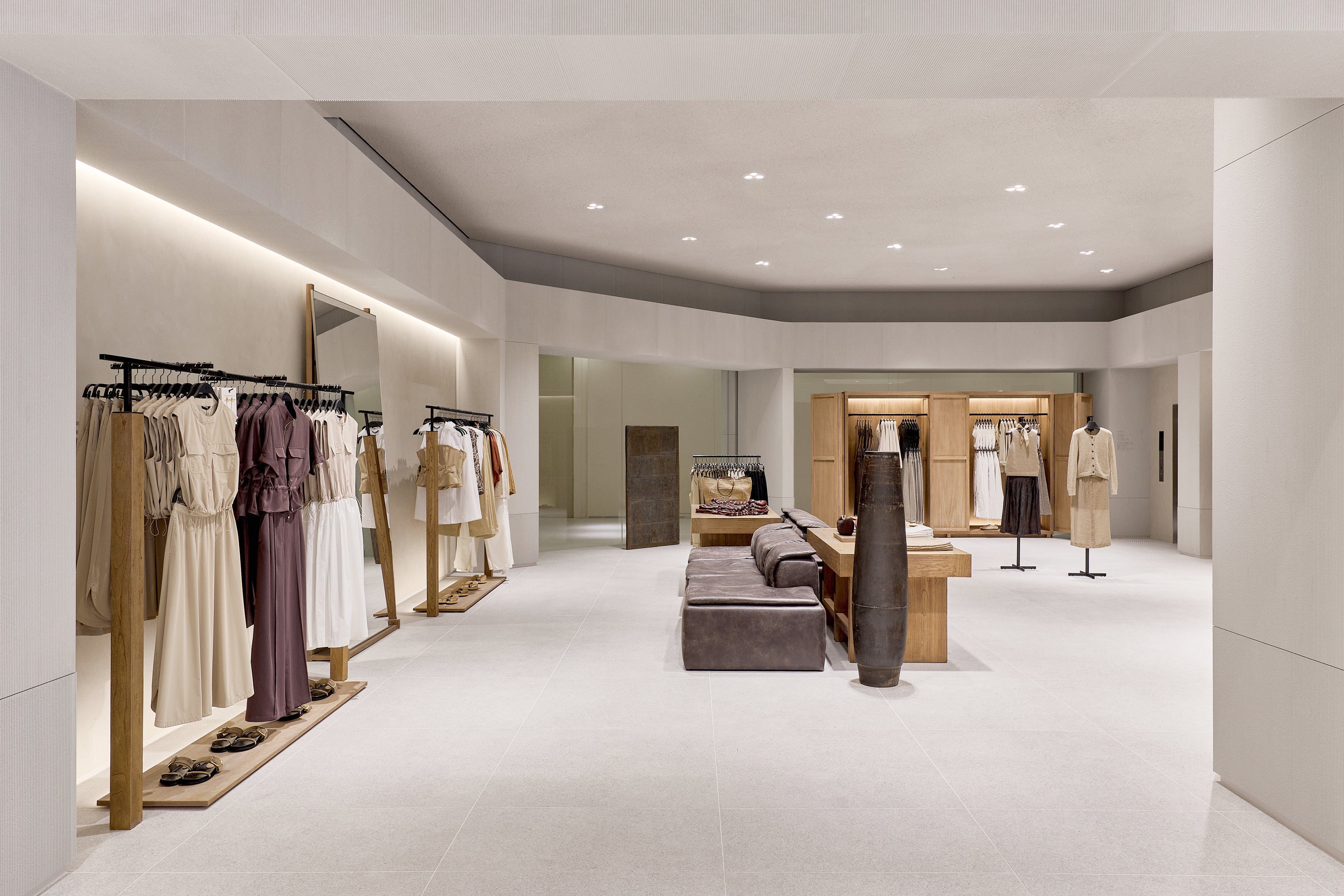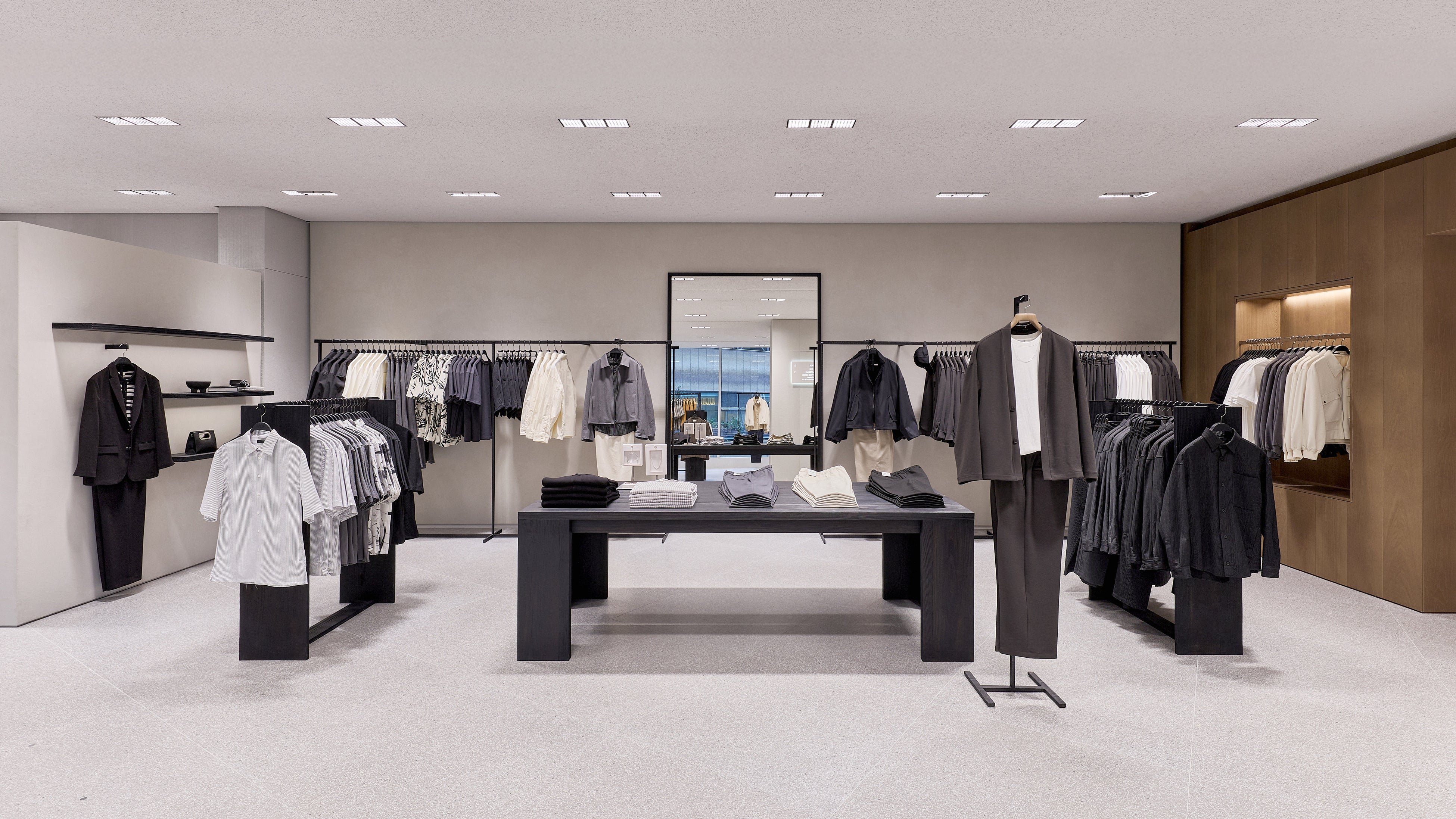 ストア面積は約 1,700㎡ に及び、2フロアにわたってウィメンズ、メンズ、キッズのコレクションを展開。ZARAの建築スタジオが手がけた内装デザインは、洗練されたライトグレーを基調とし、木製什器やテキスタイルの自然な色合いが温かみを添える、クリーンで落ち着いた空間となっています。
