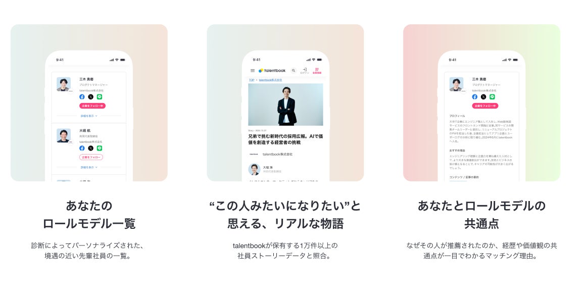 talentbookはこれまで、法人向けの採用ブランディング支援を通じて、企業の魅力的なロールモデルを1万以上発掘してきました。今回の「ロールモデル診断」リリースは、蓄積してきたロールモデルデータベースを個人に開放し、求職者一人ひとりが"憧れの先輩"と出会える価値を提供する大きな一歩となります。