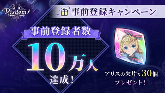 この事前登録キャンペーンでは、登録者数に応じたプレゼントを設定しました。この度、事前登録者数が 10 万人を達成しましたので、事前登録された方全員に「アリスの欠片 30 個」を追加プレゼントいたします。尚、事前登録キャンペーン期間は 3 月 11 日までになります。