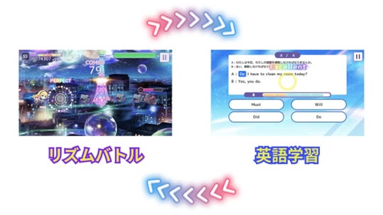 リズムバトルと英語学習が融合した英語攻略リズムゲーム。ゲーム感覚で楽しく英語学習が習慣化し、英検® 5 級 ~ 1 級レベル・TOEIC® 600 ~ 900 点レベルの語彙力と文法力が自然と身につくことを目指します。