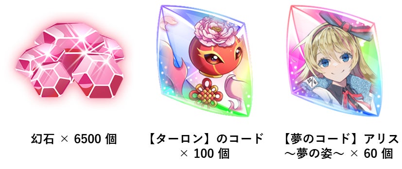内 容: 幻石 × 6500 個、【ターロン】のコード × 100 個、【夢のコード】アリス~夢の姿~ × 60 個