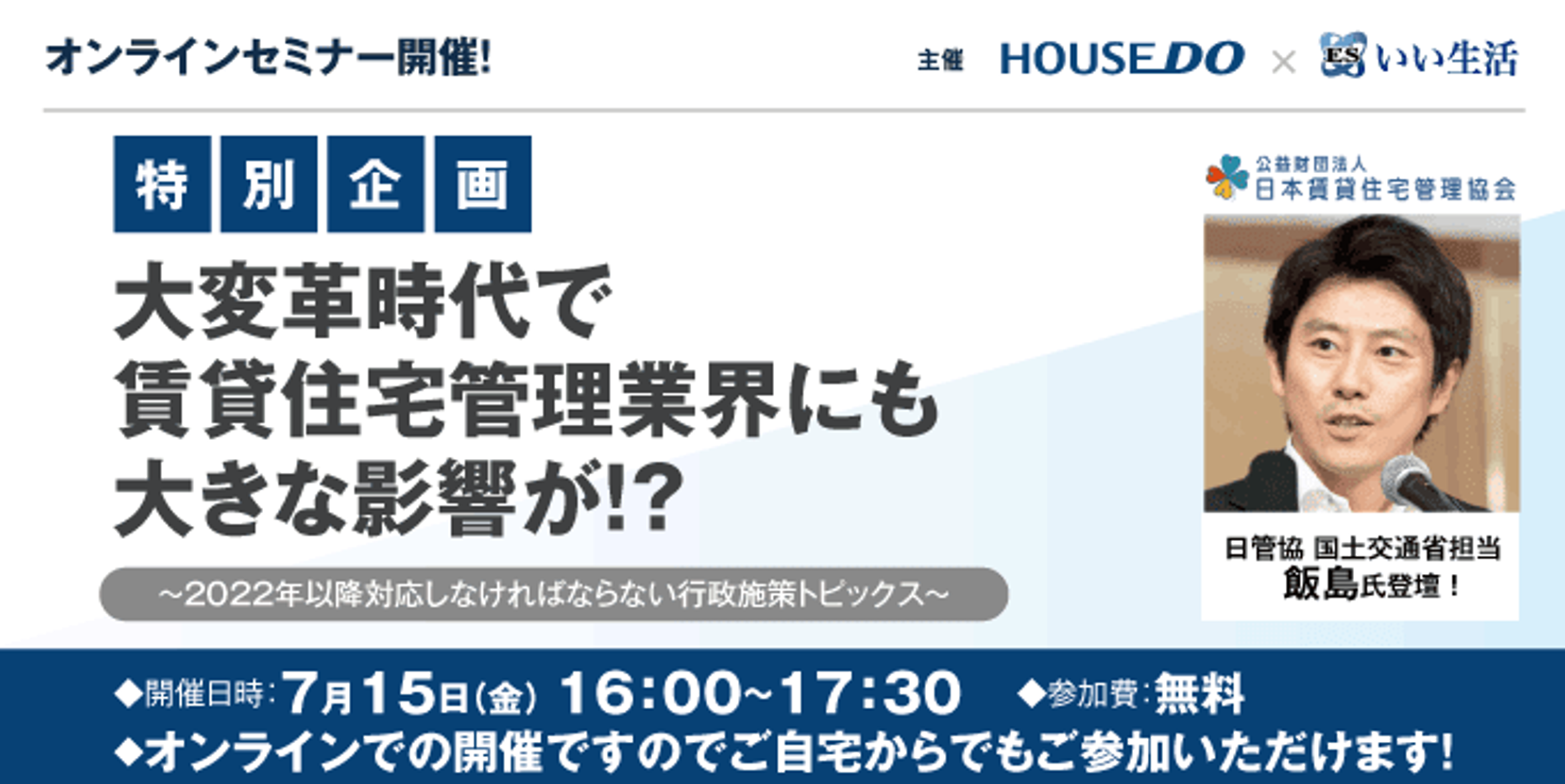当社は、いい生活と共同で、賃貸管理業界の最前線情報として、管理会社の管理物件獲得・業務効率化などのポイントについてお伝えするオンラインセミナーを初開催いたします。また、公益財団法人日本賃貸住宅管理協会の事務局次長で国土交通省担当の飯島繁樹様を特別招聘し、『大変革時代で賃貸住宅管理業界にも大きな影響が!?』と題して、2022年以降に管理会社が対応しなければならない行政施策について情報共有いたします。