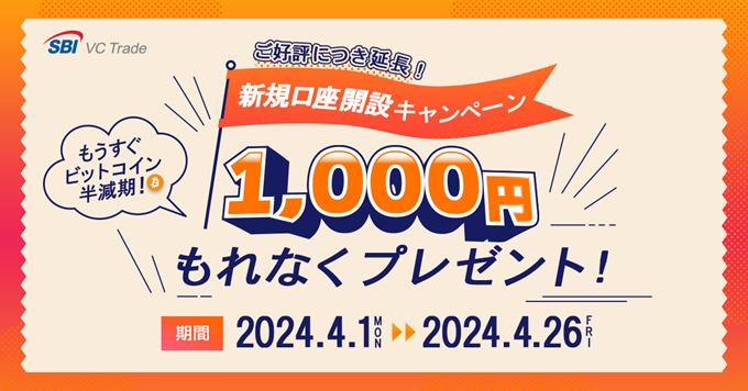SBI VCトレード株式会社(本社:東京都港区、代表取締役社長:近藤 智彦、以下「当社」)は、ご好評につき「【もうすぐビットコイン半減期】新規口座開設キャンペーン」を延長し、2024年4月26日まで実施することをお知らせいたします。