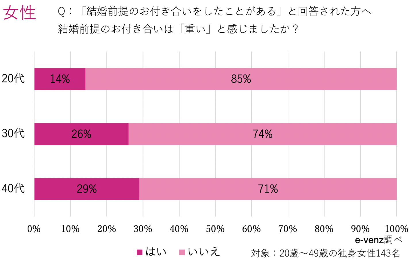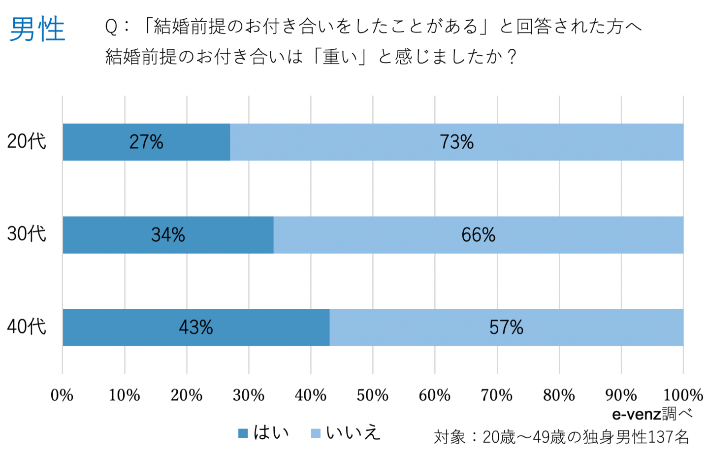 「結婚前提のお付き合いは重い」と回答した方は、男性が20代27%・30代34%・40代43%となっており、女性は20代14%・30代26%・40代29%でした。