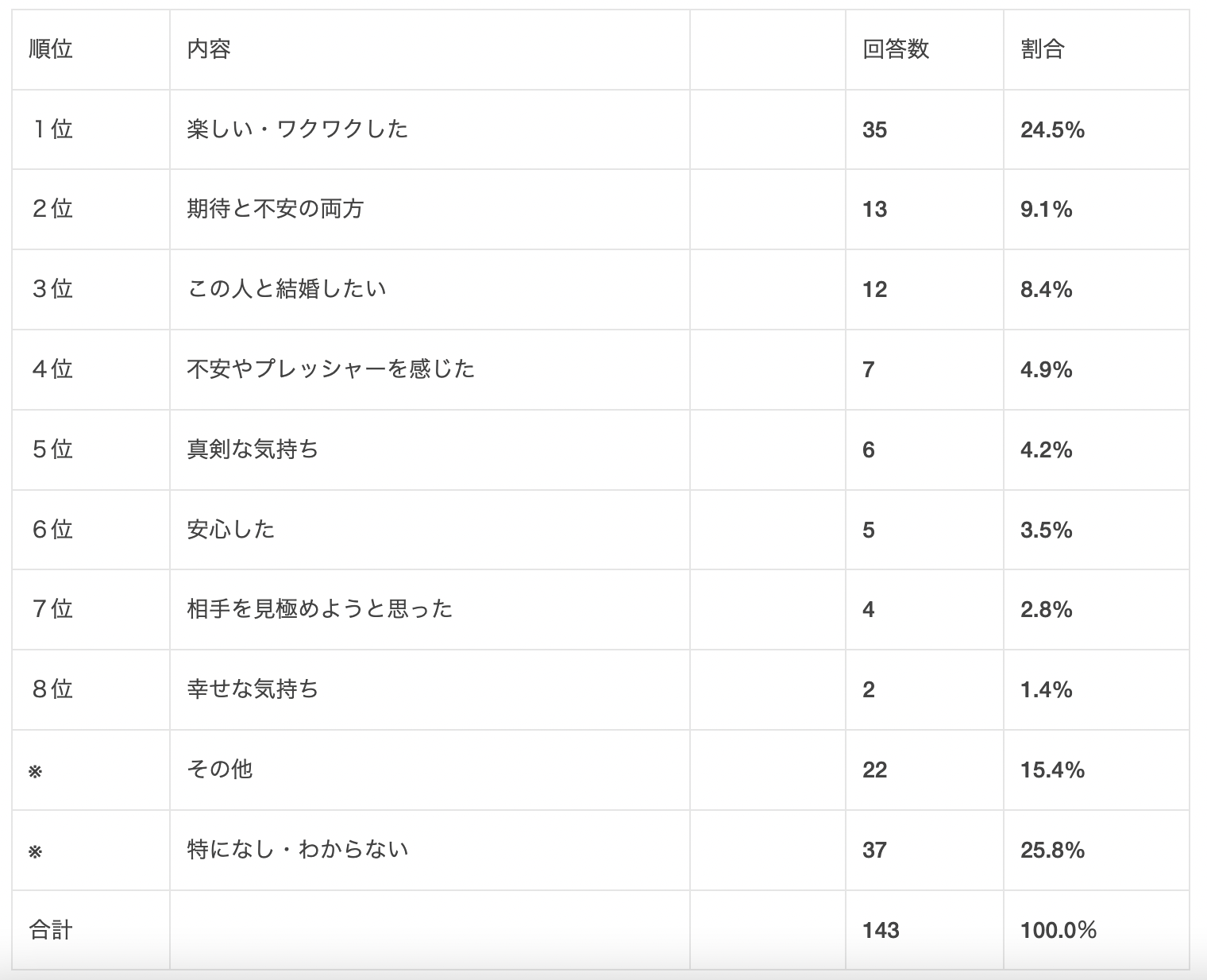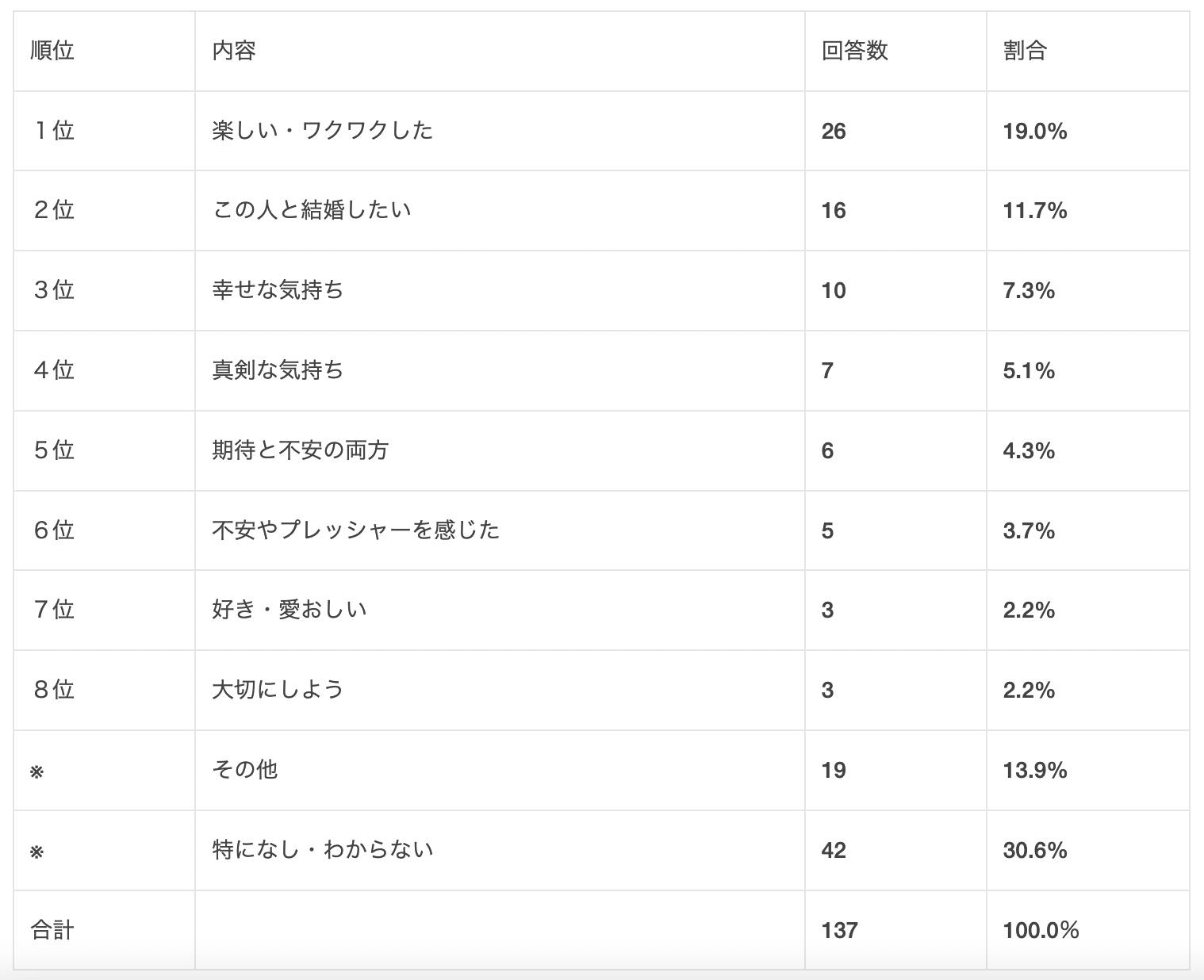 続いて2位「期待と不安の両方」9.1%・3位「この人と結婚したい」8.4%がトップ3でした。