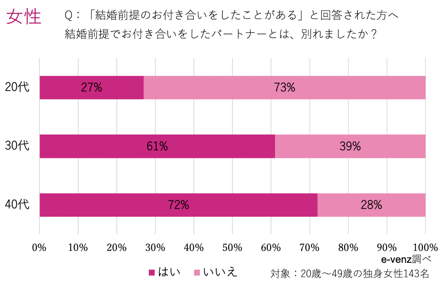 婚活・恋活や街コンなど中心とする男女の出会いメディアe-venz(イベンツ)を運営するノマドマーケティング株式会社(所在地:東京都渋谷区、代表取締役:三輪賢治)では、全国の20代から40代の独身男女を対象に結婚前提に付き合うことについてのアンケートを実施しました。