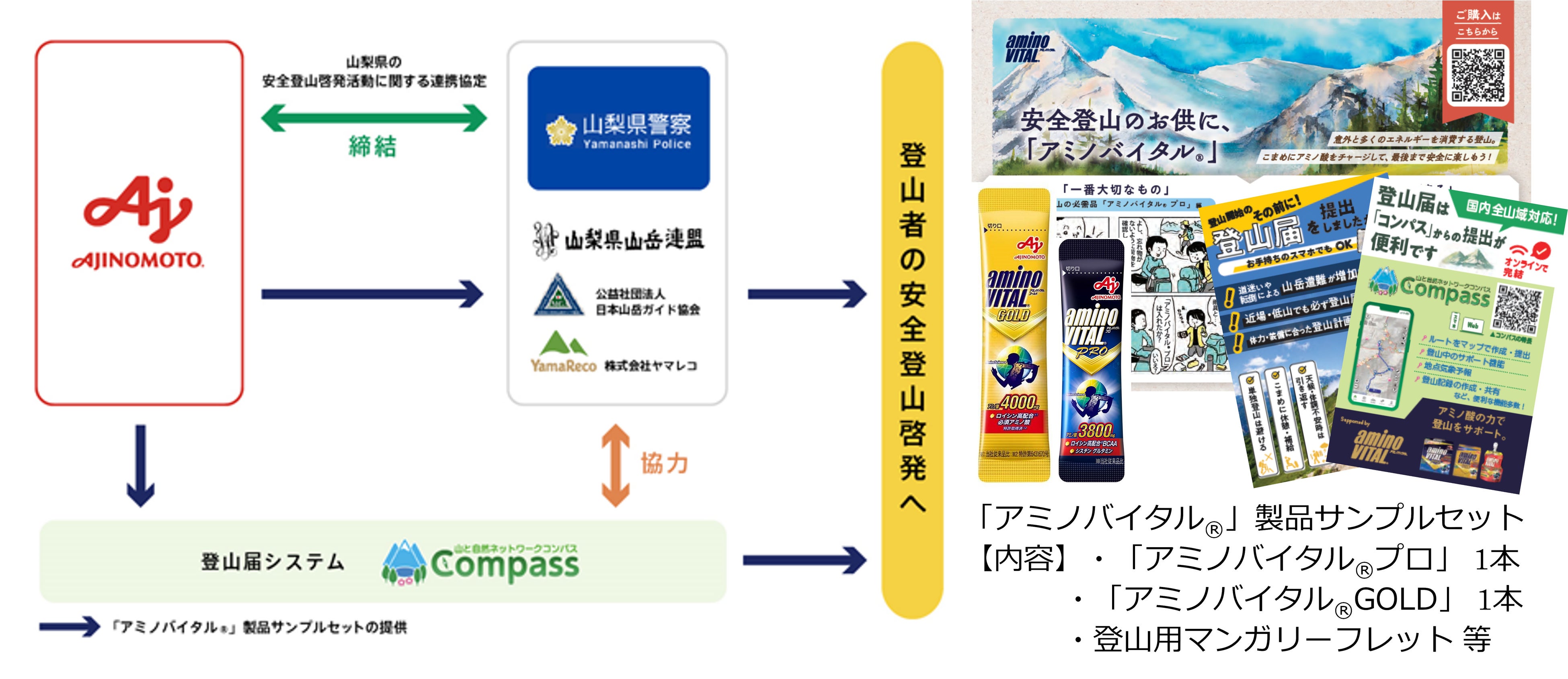 当社は、この取り組みにおいて「アミノバイタル®」製品サンプルセットを提供し、山梨県警や山岳連盟、ガイド協会が運営する登山計画共有システム「コンパス」※などを通じて、登山者に配布することで、登山者の栄養補給や体調管理を支援していきます。また当サンプルセットの配布により、「コンパス」への会員登録を促進し、遭難や事故を未然に防ぐことが可能となります。今後は、「コンパス」や、ヤマレコ社が運営する登山専用コミュニティサイト「ヤマレコ」とタイアップし、アミノ酸摂取による安全登山の啓発活動を行う予定です。