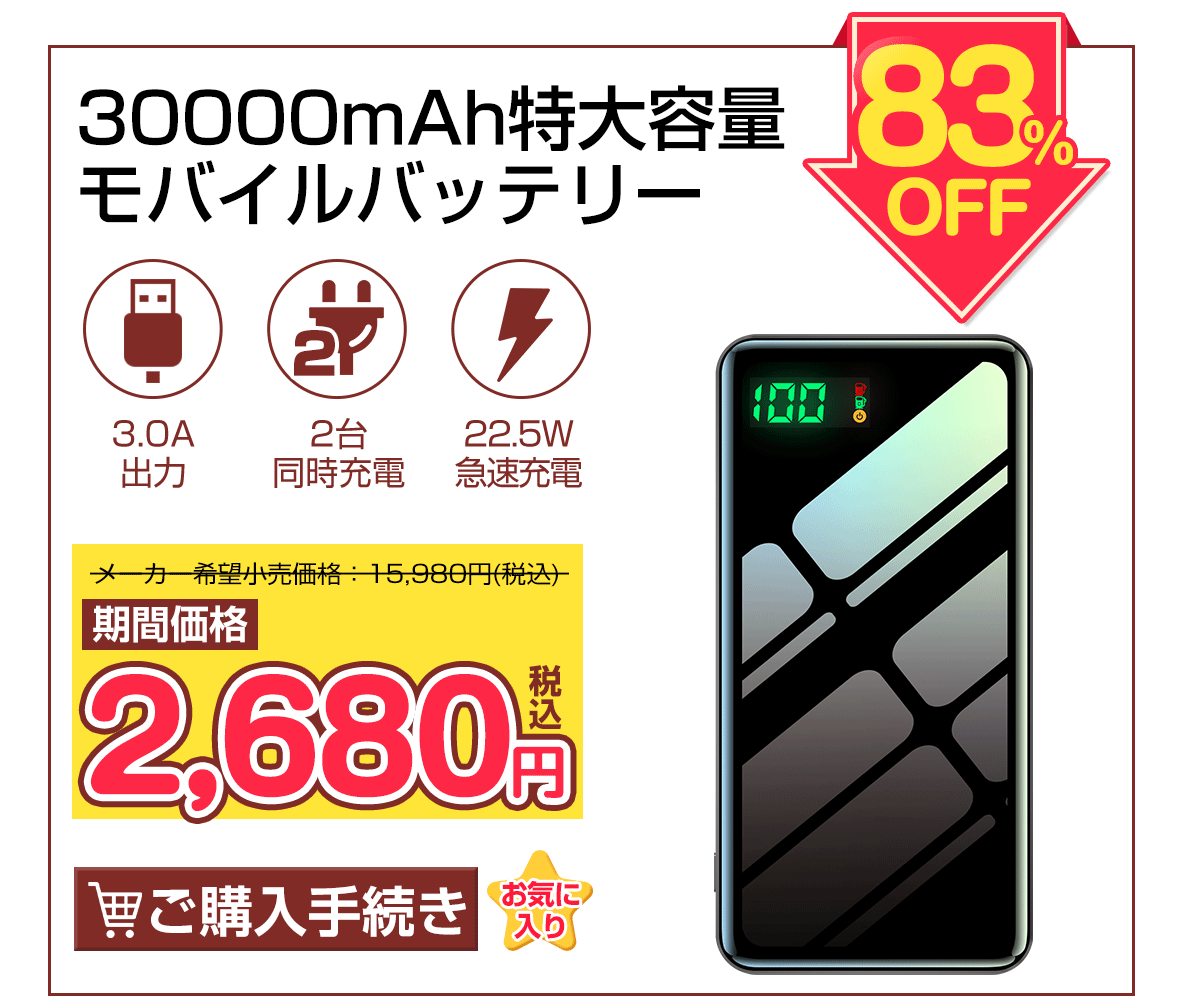普段使いから災害時でも:大容量30000mAh/iPhone12で6回以上充電可/急速充電/2代同時充電/電池残量/安全回路設計