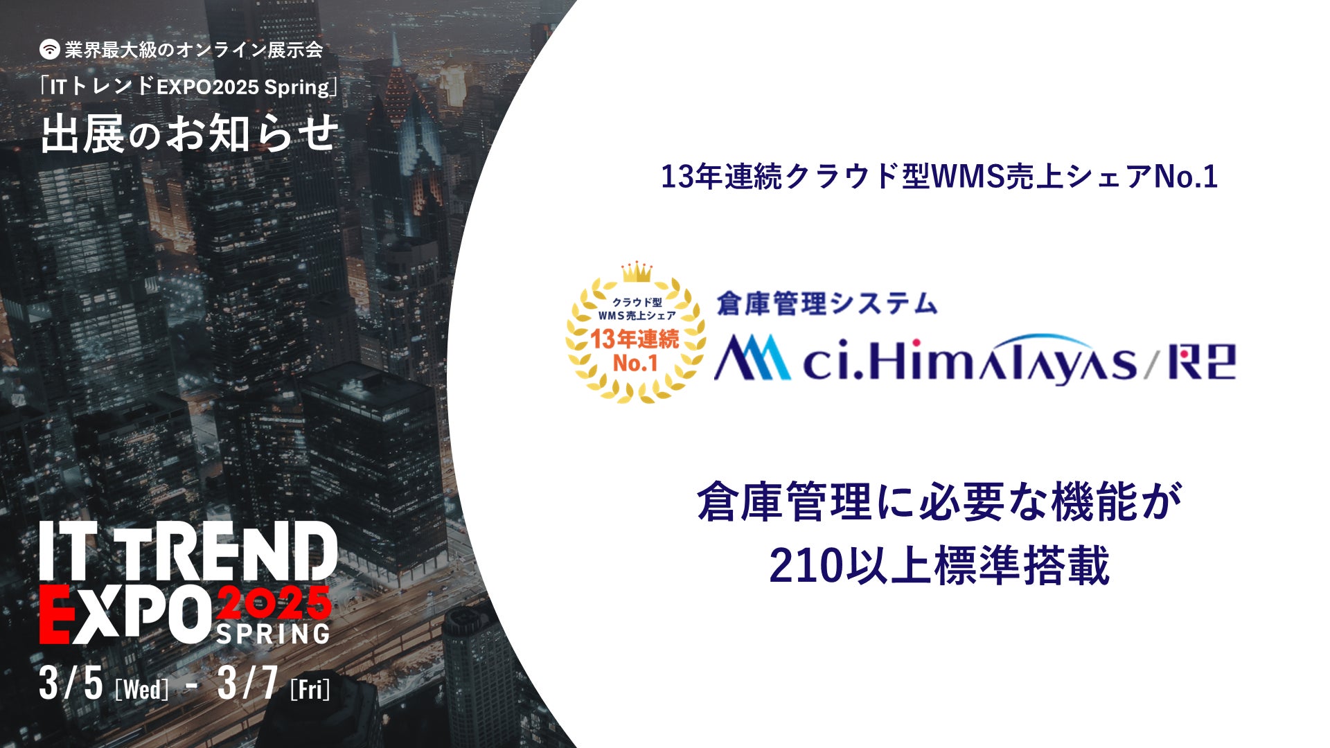 クラウド型倉庫管理システム(以下、WMS)の開発提供を手掛ける株式会社シーネット(以下シーネット、本社:千葉県千葉市、代表取締役兼CEO:小野崎伸彦)が提供する『ci.Himalayas/R2』 は、株式会社イノベーション(東証グロース 証券コード3970)のグループ会社である、株式会社Innovation & Co.(本社:東京都渋谷区、代表取締役社長:齊藤和馬、以下「Innovation & Co.」)が主催する業界最大級のオンライン展示会「ITトレンドEXPO2025 Spring」に出展します。