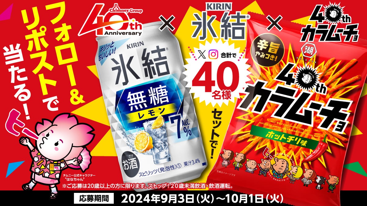 40周年の感謝の気持ちを込めて、合計40名様に小袋 スティックカラムーチョ ホットチリ味4袋 (33g入り×4袋)とキリン 氷結®無糖 レモン ALC.7% 6缶(350ml×6缶)をセットでプレゼントいたします。