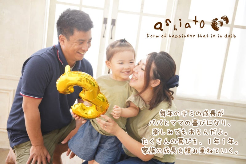 「ashiato」は、毎年1回、お子さまの成長や家族の思い出を残せる会員制撮影プランです。足跡のように思い出を積み重ねてほしいという想いを込めたこのプランでは、5年間にわたり毎年1回撮影が可能。通常よりお得な会員価格で撮影ができ、一組一組のご家族の想いを大切に記録します。