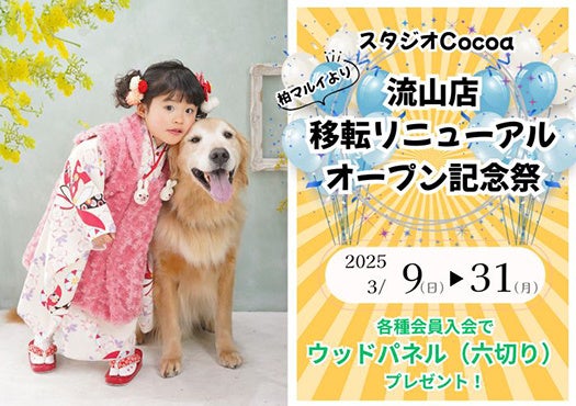 株式会社小野写真館(茨城県ひたちなか市東大島、代表取締役 小野哲人)がお宮参りや七五三の貸衣装、スマッシュケーキを用いた誕生記念、家族の成長記録、ペットとの同伴撮影、ペットのみを撮影するキッズ・ファミリー向けフォトスタジオ「スタジオCocoa流山店」が本日移転リニューアルオープンいたしました。