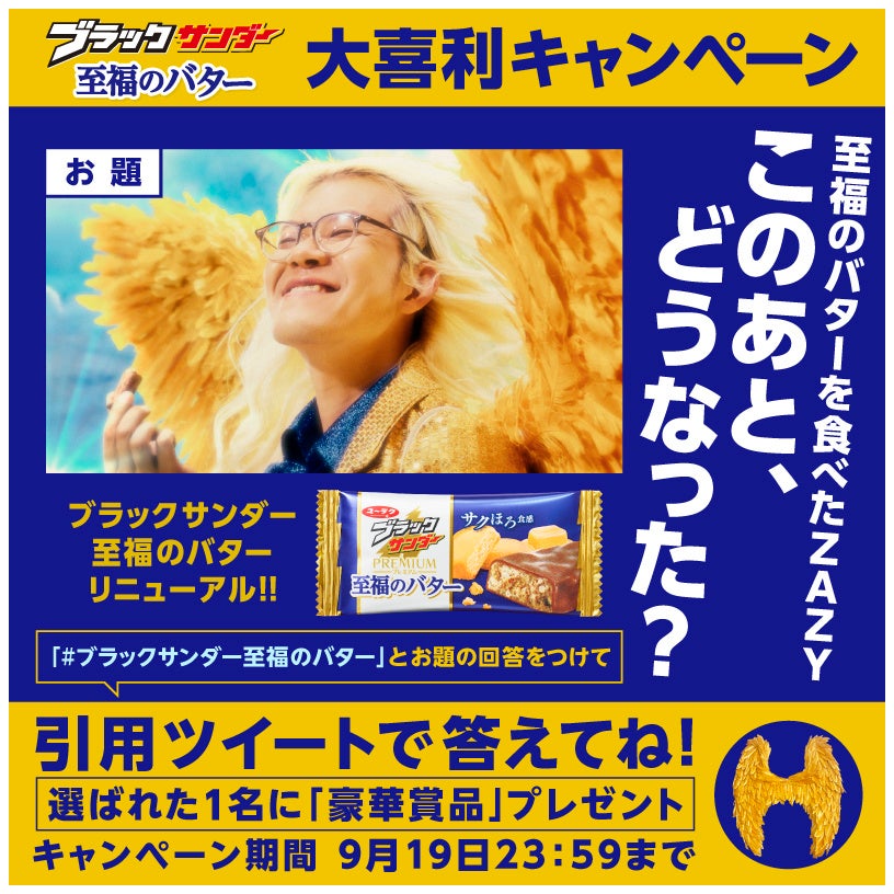 有楽製菓株式会社(本社:東京都小平市、代表取締役社長 河合辰信)は、2022年9月15日(木)〜9月19日(月・祝)、9月27日(火)からの『ブラックサンダー至福のバター』リニューアル発売を記念して、“PR天使” ZAZYさんを起用した大喜利投稿キャンペーンを公式Twitterにて実施いたします。