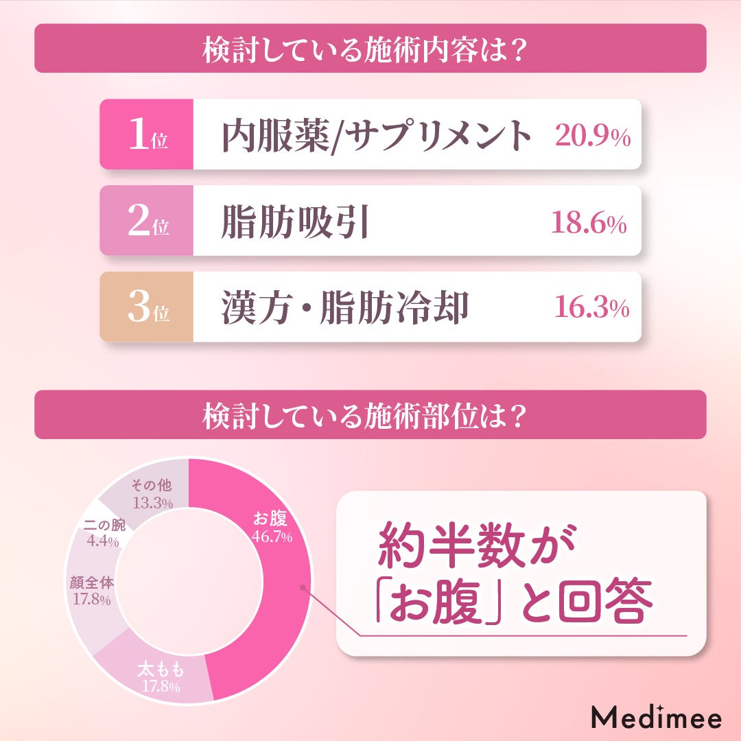 そして、お腹に次いで「太もも」「顔全体」の施術を検討しているという結果でした。