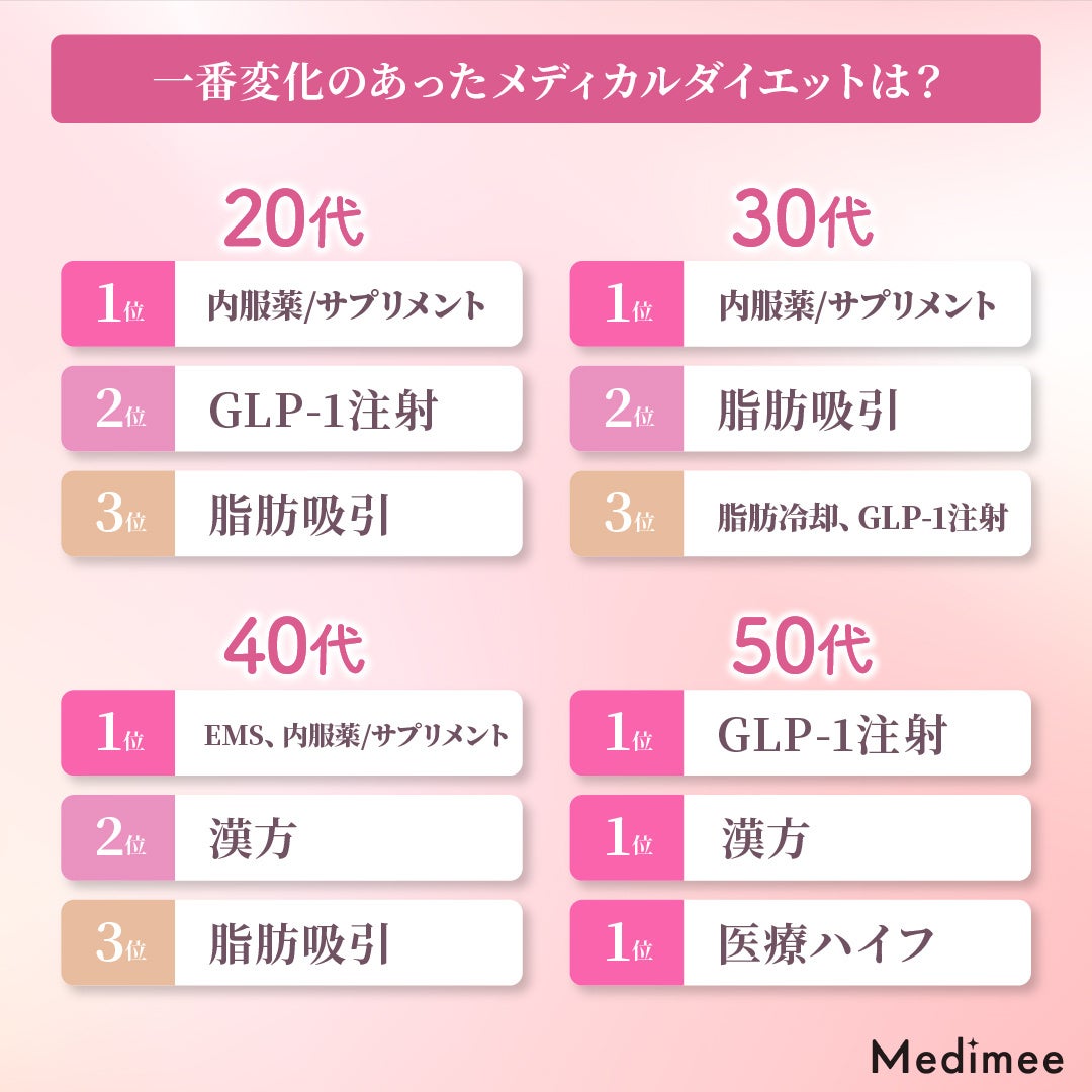 脂肪冷却やEMS、内服薬・サプリメント、GLP-1注射など、多様な施術方法があり、それぞれの年代で人気の施術や変化を実感した施術が異なる結果に。